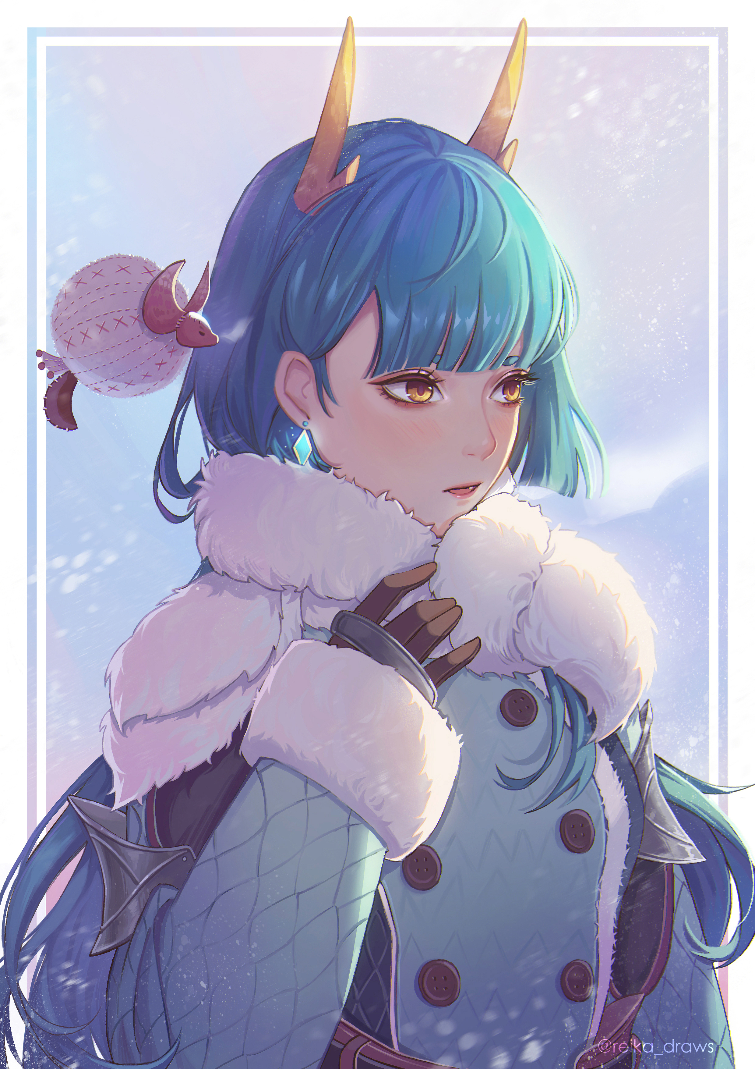 1girl absurdres armor blue_coat blue_hair blunt_bangs brown_gloves coat earrings eyebrows_hidden_by_hair fur-trimmed_sleeves fur_scarf fur_trim gloves highres horns jewelry long_hair long_sleeves monster_hunter:_world monster_hunter_(series) original parted_lips reika_(reikadraws) scarf sleeves_past_wrists snow solo twitter_username upper_body white_scarf winter_clothes winter_coat yellow_eyes