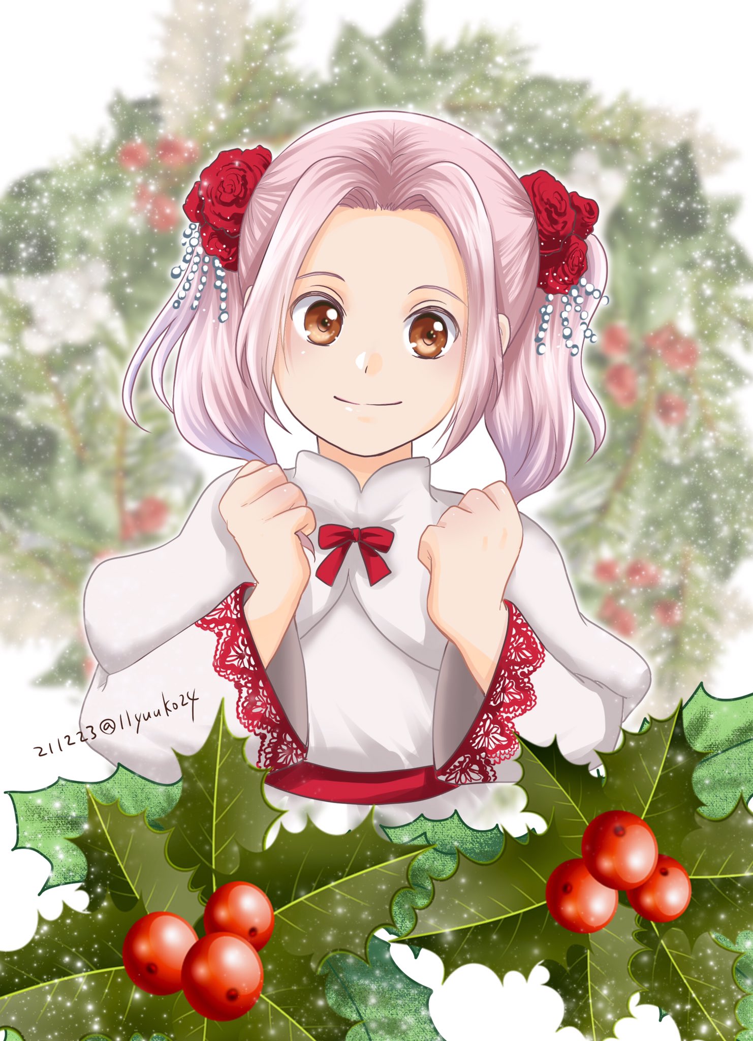 1girl bow capelet christmas dated dress flower hair_flower hair_intakes hair_ornament hannelore_(honzuki_no_gekokujou) highres honzuki_no_gekokujou long_hair long_sleeves looking_at_viewer pink_hair red_bow red_eyes red_flower red_rose rose solo twintails twitter_username white_capelet white_dress yuuko24
