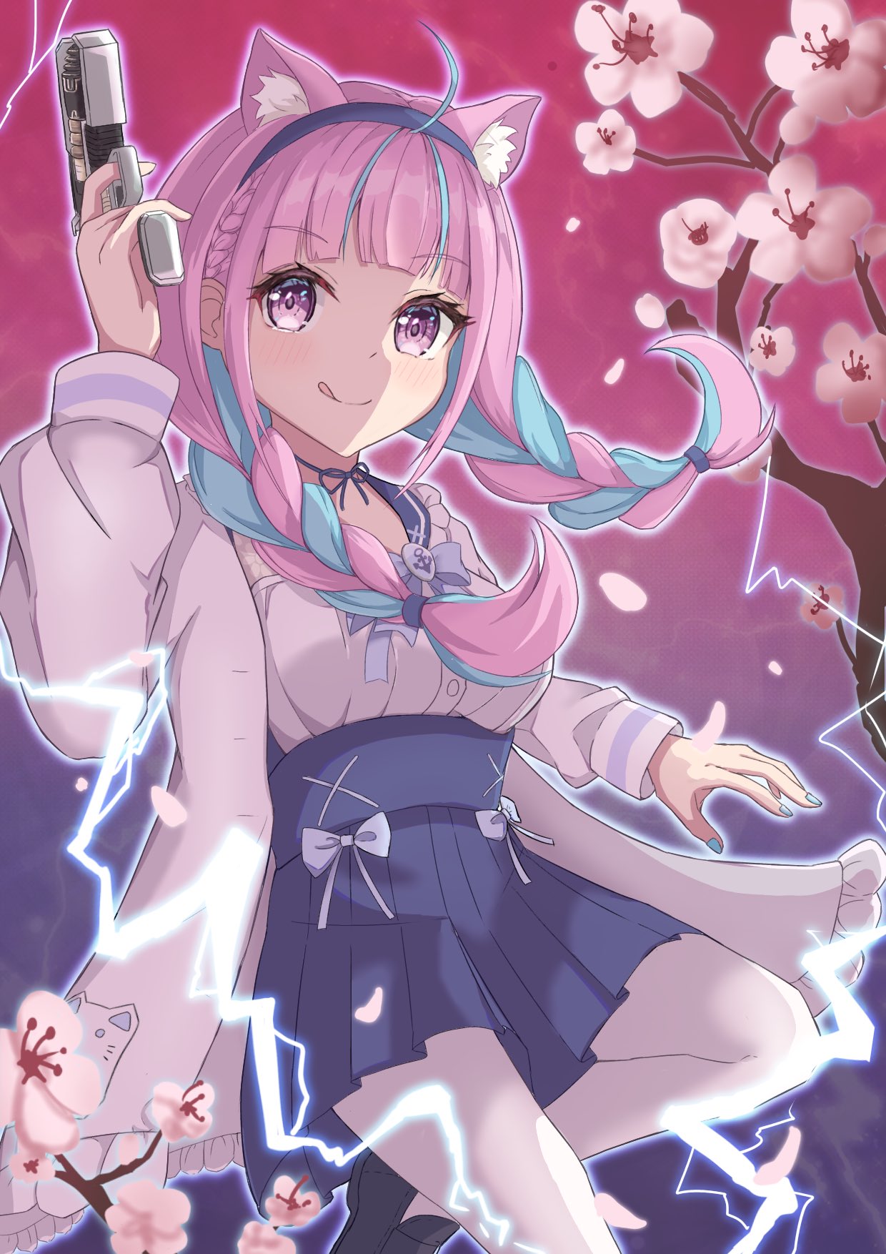 1girl animal_ear_fluff animal_ears apex_legends b3_wingman blue_hair blue_hairband blue_skirt braid breasts cat_ears cherry_blossoms cowlick electricity flower gun hairband handgun high-waist_skirt highres holding holding_gun holding_weapon hololive jacket kakari_(user_gtds4527) medium_breasts minato_aqua minato_aqua_(sailor) pink_flower pink_hair revolver shirt skirt solo thighhighs twin_braids virtual_youtuber weapon white_jacket white_shirt white_thighhighs