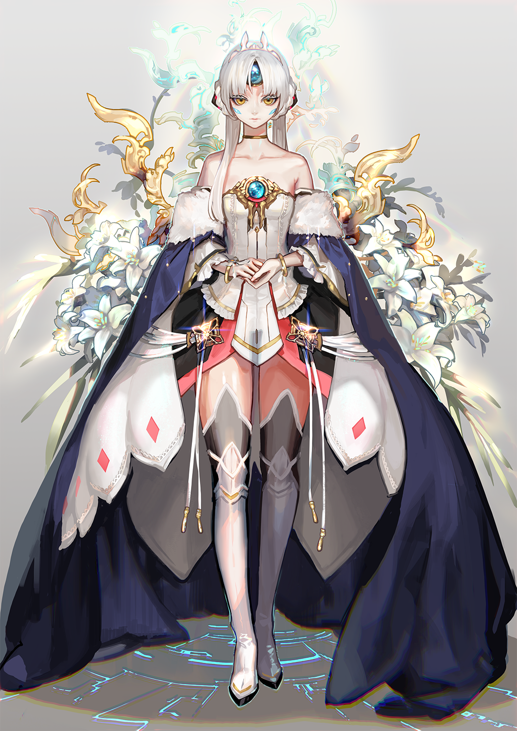 1girl bare_shoulders boots bracelet choker chromatic_aberration code:_empress_(elsword) collarbone dress elsword eve_(elsword) expressionless facial_mark flower forehead_jewel full_body fur_trim glowing grey_background hair_over_shoulder highres jewelry kabi_(kb) neon_lights open_clothes open_skirt ornament skirt solo standing thigh_boots yellow_eyes