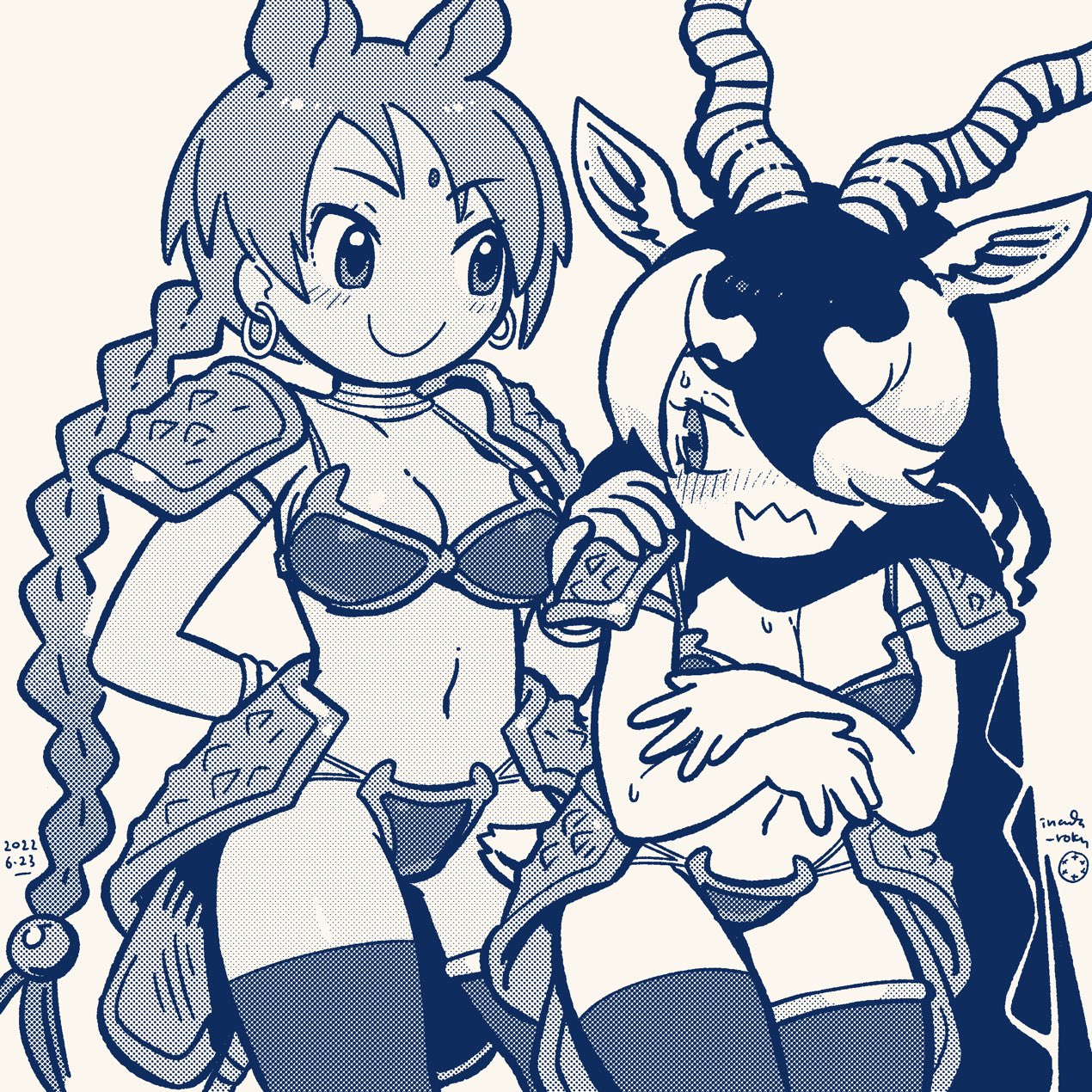 2girls animal_ears antelope_ears antelope_horns arm_behind_back armor beads bikini_armor blackbuck_(kemono_friends) blush braid braided_ponytail breasts c: cape cleavage closed_mouth cosplay covering_privates covering_breasts earrings embarrassed facial_mark forehead_mark hair_beads hair_ornament hair_over_one_eye hand_on_another's_shoulder hands_up highres horizontal_pupils horns inada_roku indian_rhinoceros_(kemono_friends) indian_rhinoceros_(kemono_friends)_(cosplay) jewelry kemono_friends kemono_friends_3 long_bangs long_braid long_hair looking_at_another medium_hair monochrome multicolored_hair multiple_girls navel neck_ring revealing_clothes rhinoceros_ears rhinoceros_girl shoulder_armor single_braid smile stomach sweat swept_bangs tail tan thighhighs two-tone_hair very_long_hair wavy_mouth