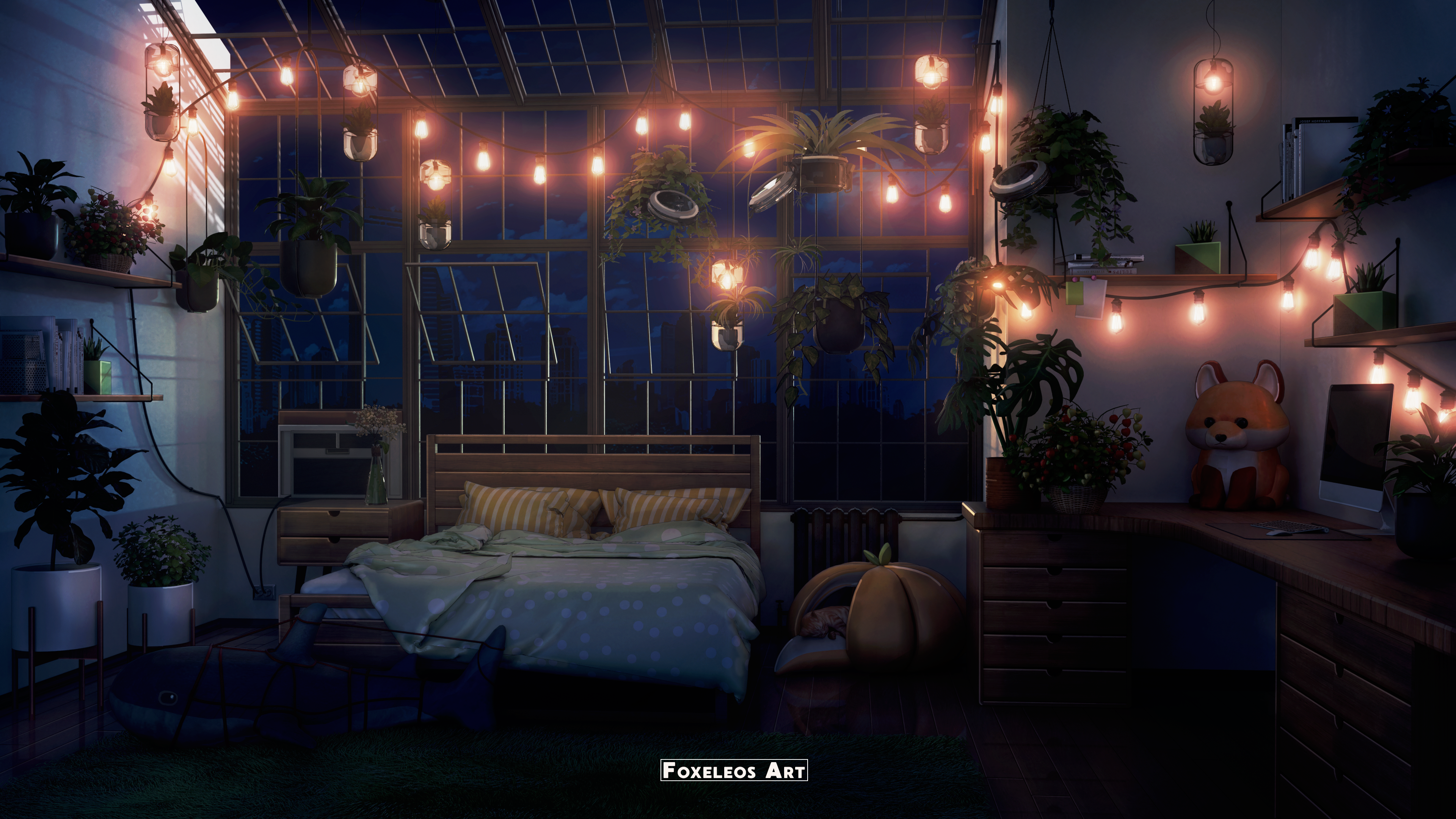 3d absurdres bed blanket blender_(medium) building cable carpet cat commentary computer_keyboard computer_mouse desk electrical_outlet english_commentary foxeleos highres indoors light_bulb monitor mousepad_(object) night no_humans open_window original photoshop_(medium) pillow plant radiator scenery sky string stuffed_animal stuffed_toy wall watermark window wooden_floor