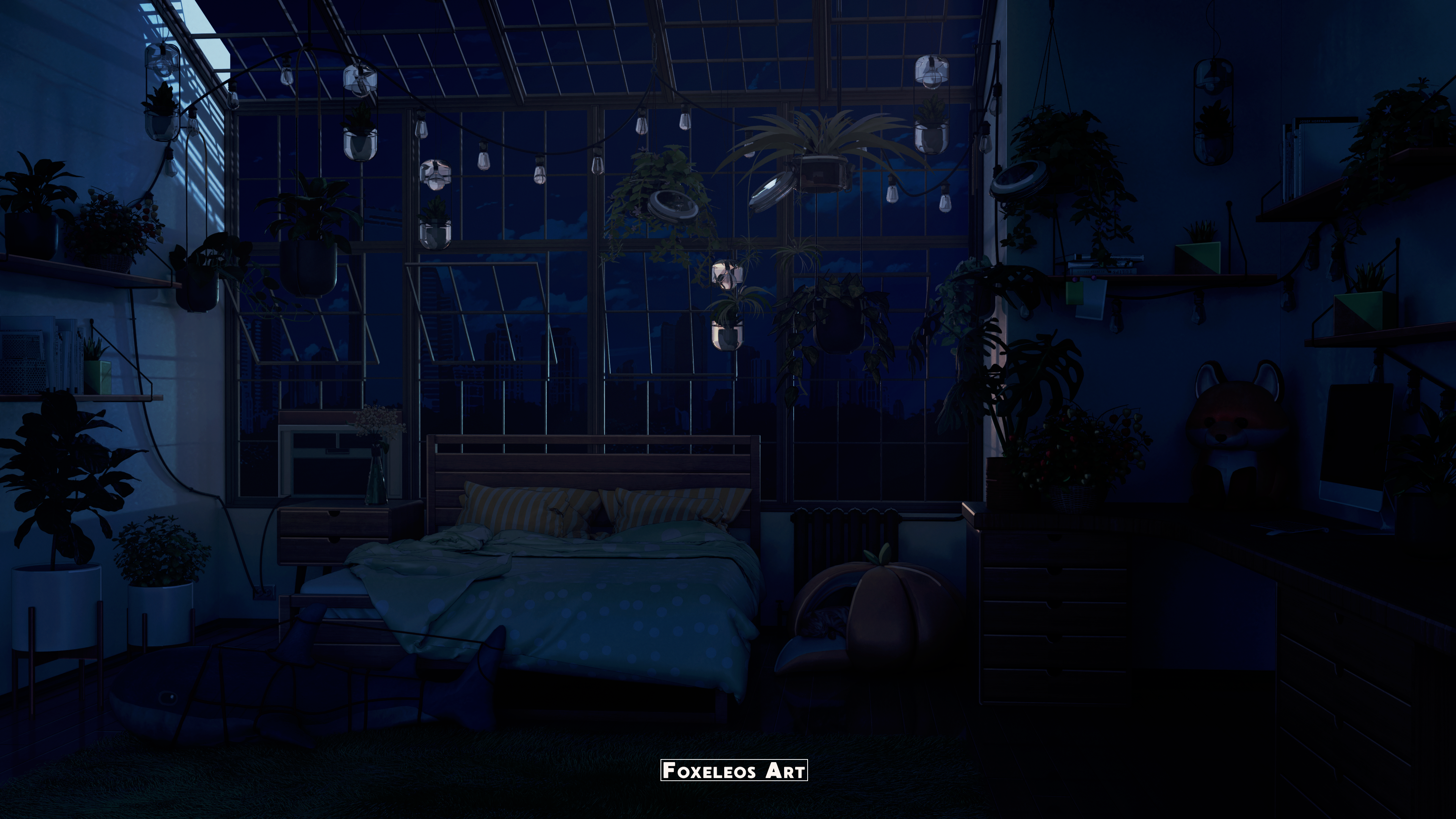 3d absurdres bed blanket blender_(medium) building cable carpet cat commentary computer_keyboard computer_mouse desk electrical_outlet english_commentary foxeleos highres indoors light_bulb monitor mousepad_(object) night no_humans open_window original photoshop_(medium) pillow plant radiator scenery sky string stuffed_animal stuffed_toy wall watermark window wooden_floor