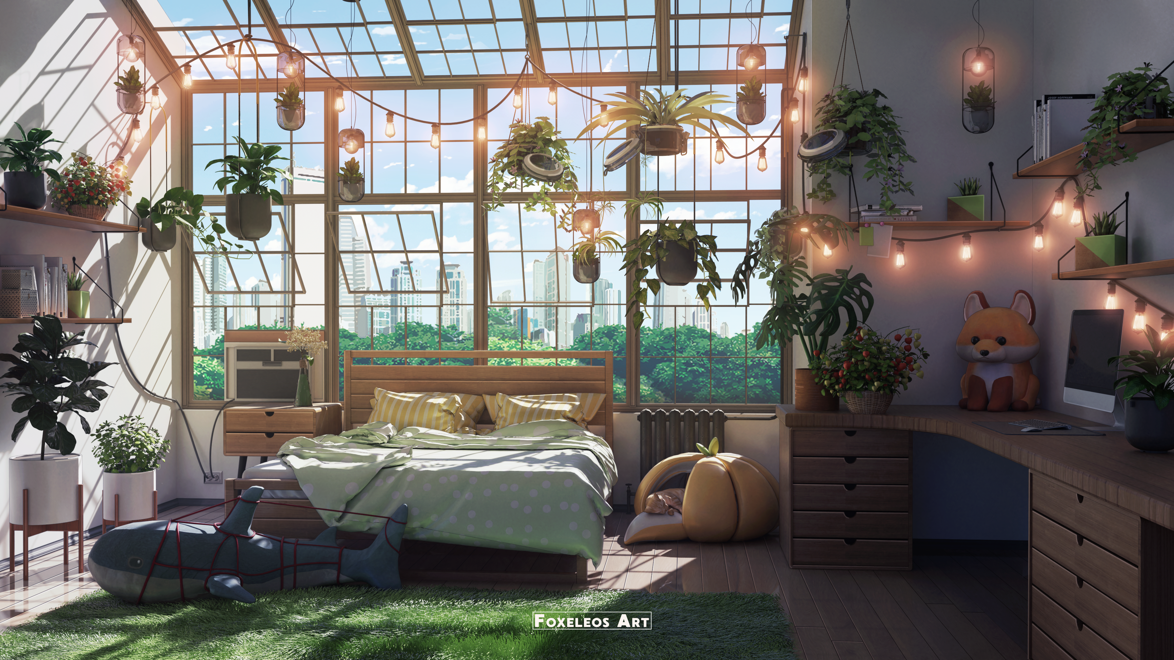 3d absurdres bed blanket blender_(medium) blue_sky building cable carpet cat commentary day desk electrical_outlet english_commentary foxeleos highres indoors computer_keyboard light_bulb monitor computer_mouse mousepad_(object) no_humans open_window original photoshop_(medium) pillow plant radiator scenery sky string stuffed_animal stuffed_toy wall watermark window wooden_floor