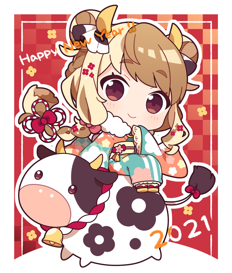 1girl 2021 bell blonde_hair blush bow braid brown_eyes brown_hair chibi chinese_knot chinese_zodiac cow double_bun english_text floral_print fur_collar hair_bow hair_bun hair_ornament hairclip hand_up happy_new_year horns japanese_clothes kimono koguma105 lace_trim long_hair long_sleeves looking_at_viewer multicolored_hair neck_bell new_year obi on_animal original rope sash sidesaddle sitting smile solo tail tail_bow tail_ornament twin_braids two-tone_hair wide_sleeves year_of_the_ox
