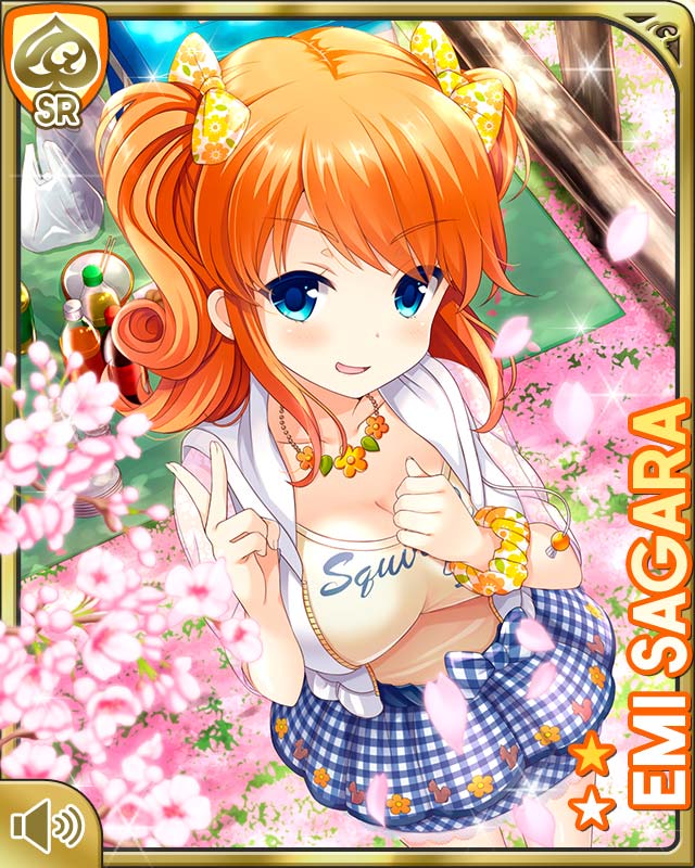 1girl blue_eyes blue_skirt bow breasts character_name checkered_clothes checkered_skirt day english_text girlfriend_(kari) hair_bow jacket jewelry looking_at_viewer medium_hair official_art open_mouth orange_hair orange_shirt outdoors park qp:flapper sagara_emi wrist_scrunchie shirt skirt smile solo tagme tree two_side_up white_jacket white_legwear yellow_bow yellow_shirt