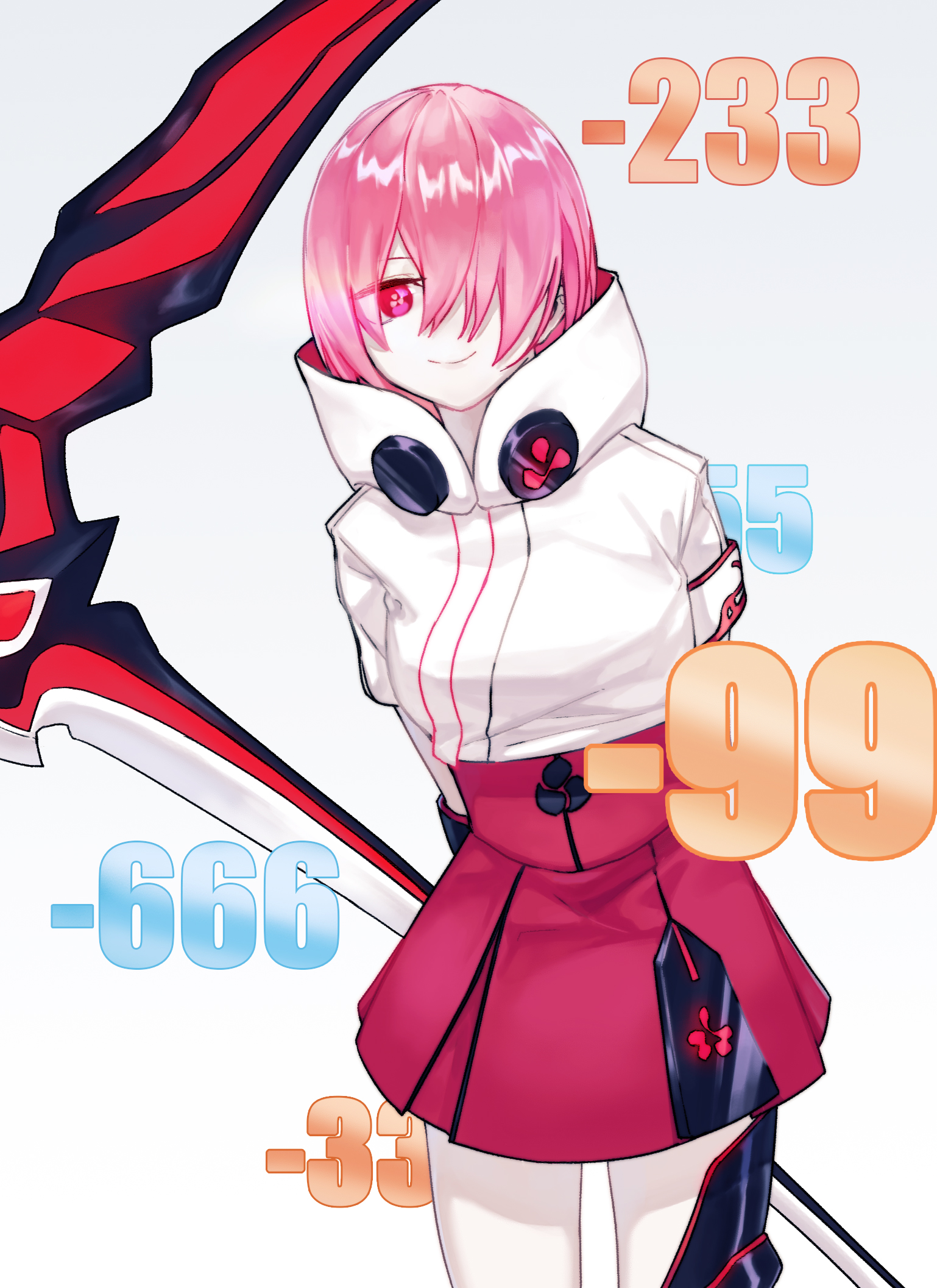 1girl bai_lan_gen(1845106313) closed_eyes closed_mouth damage_numbers grey_background hair_over_one_eye highres holding holding_scythe holding_weapon honkai_(series) honkai_impact_3rd jacket looking_at_viewer multicolored_jacket pink_eyes pink_hair pink_jacket scythe short_hair smile solo weapon white_jacket zombie_(honkai_impact)