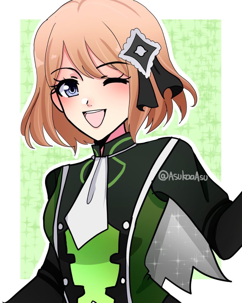 1girl ascot asukaaasuu black_dress black_ribbon buttons capelet dress hair_ribbon long_sleeves looking_at_viewer nintendo official_alternate_costume one_eye_closed open_mouth pokemon pokemon_masters_ex ribbon serena_(pokemon) serena_(sygna_suit)_(pokemon) smile sparkle teeth tongue twitter_username upper_teeth_only