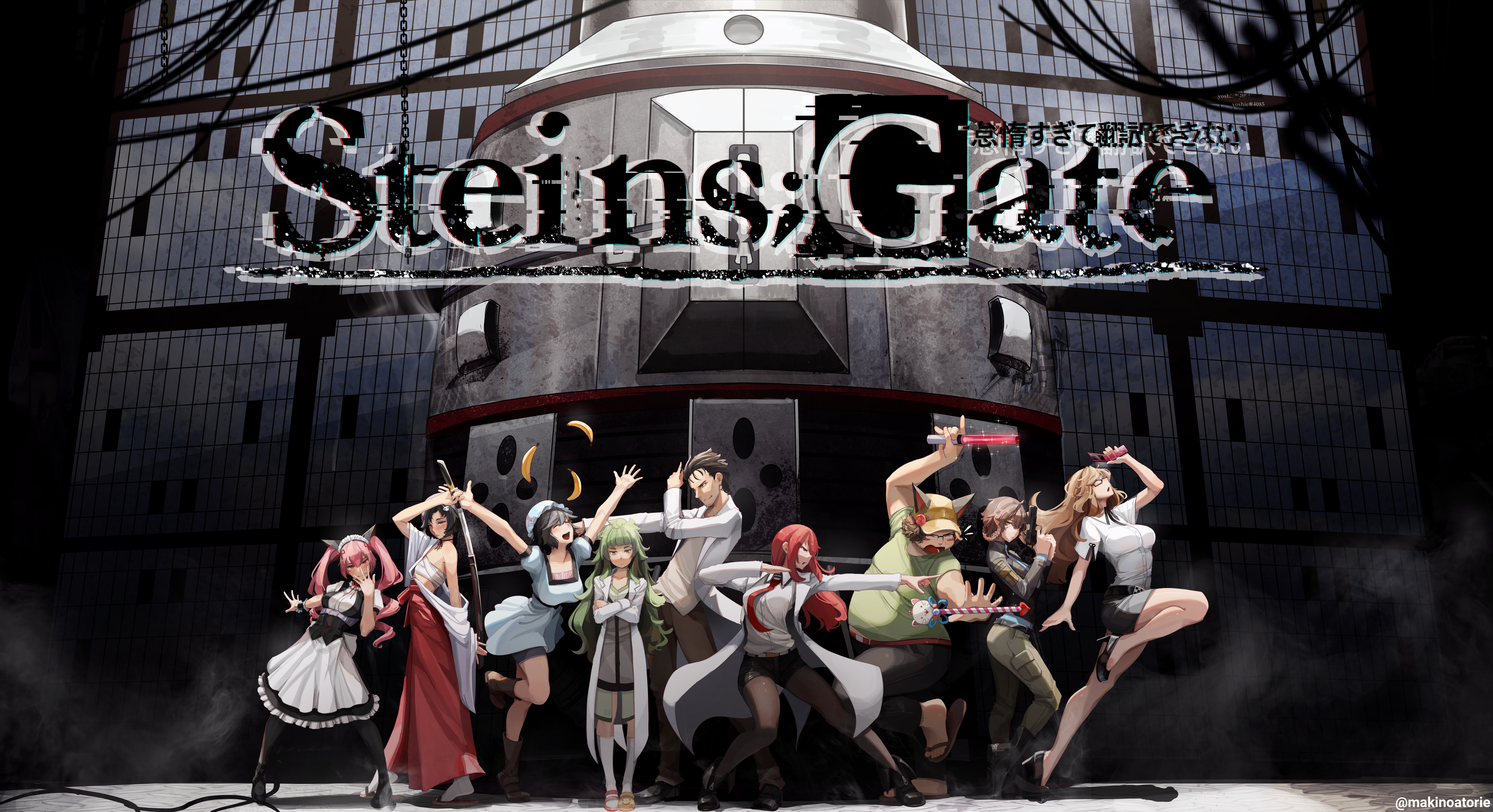 absurdres akiha_rumiho amane_suzuha amane_suzuha_(beta) animal_ears arms_up banana baseball_cap belt black_hair blush bonnet boots breasts brown_hair cat_ears cellphone closed_eyes crossed_arms dress drill_hair flip_phone food fruit glowstick green_hair gun hair_ornament hair_rings hashida_itaru hat high_heels highres hiyajou_maho japanese_clothes jojo_pose kiryuu_moeka lab_coat long_hair looking_at_viewer looking_to_the_side maid makise_kurisu necktie okabe_rintarou open_mouth pencil_skirt phone pink_hair red_eyes sandals sarashi science_adventure shiina_mayuri short_hair shorts skirt skull_hair_ornament smile socks steins;gate steins;gate_0 sushoartworks sword thighhighs twintails urushibara_luka wand weapon