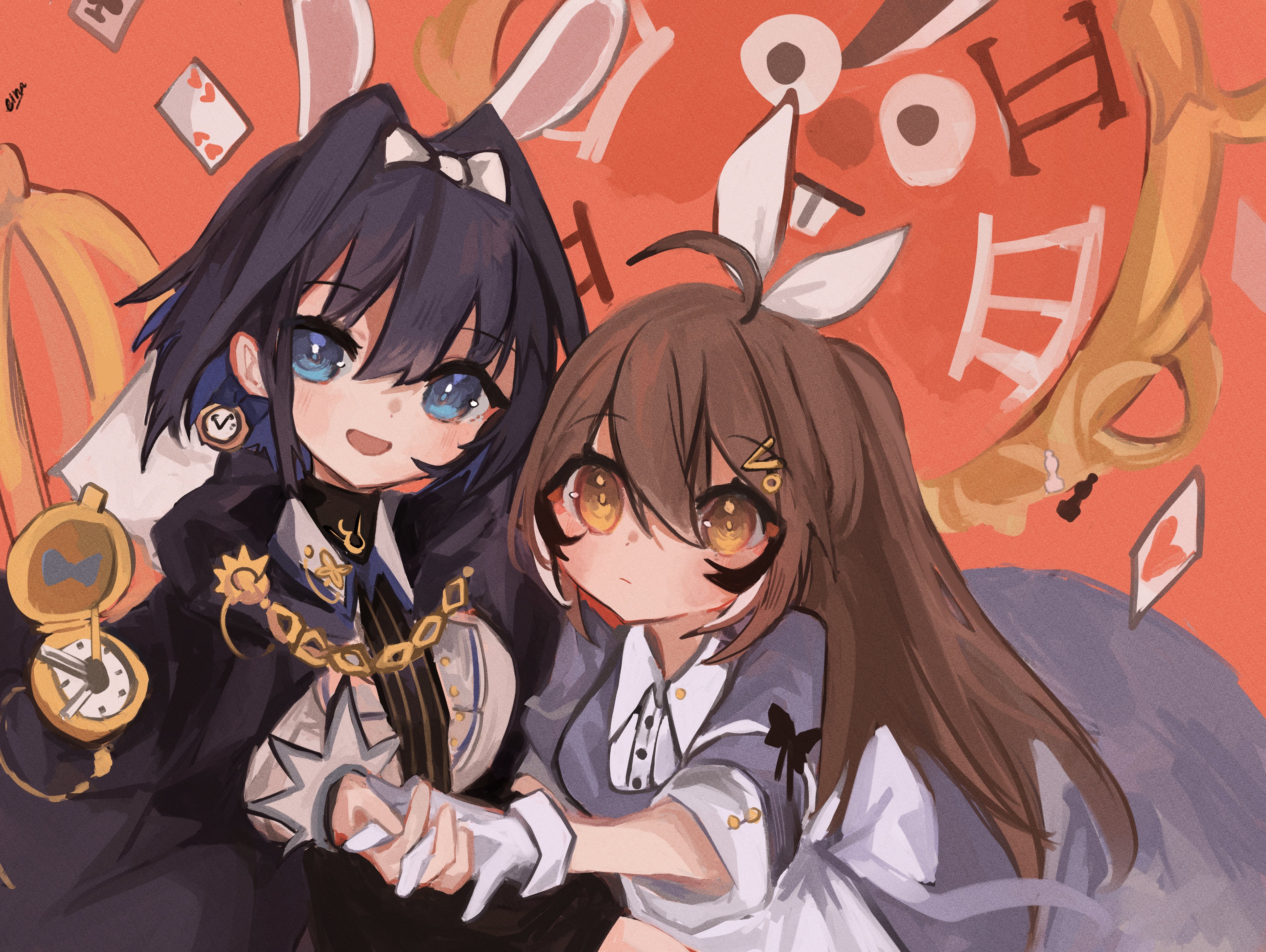 2girls absurdres ahoge alice_(alice_in_wonderland) alice_(alice_in_wonderland)_(cosplay) alice's_adventures_in_wonderland animal_ears apron birdcage black_cloak blue_dress blue_eyes blue_hair brown_eyes brown_hair cage card chain cloak clock collared_shirt cosplay dress eimmii gloves gold_chain hair_intakes hair_ornament hair_ribbon hairclip hakos_baelz hakos_baelz_(rat) halloween_baelz highres holding_hands hololive hololive_english long_hair looking_at_viewer multicolored_hair multiple_girls nanashi_mumei objectification ouro_kronii pinstripe_pattern playing_card pocket_watch ponytail rabbit_ears ribbon shirt short_hair streaked_hair striped turtleneck veil very_long_hair virtual_youtuber watch white_gloves white_rabbit_(alice_in_wonderland) white_rabbit_(alice_in_wonderland)_(cosplay) white_shirt