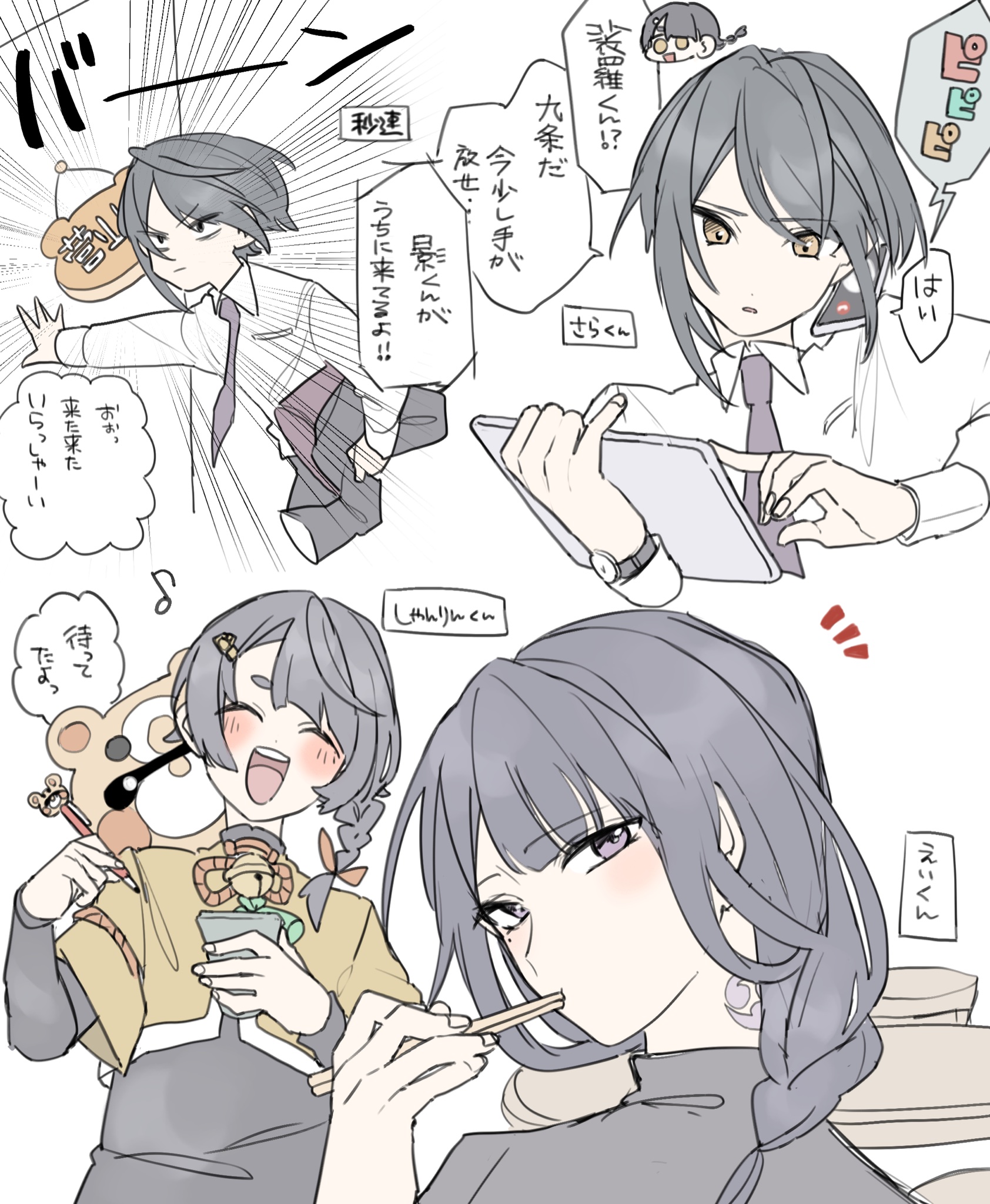 3boys blush braid chopsticks closed_eyes commentary_request eyes_visible_through_hair formal_clothes genderswap genderswap_(ftm) genshin_impact guoba_(genshin_impact) hair_between_eyes highres hiyomikun kujou_sara long_hair multiple_boys necktie purple_eyes raiden_shogun shirt short_hair suit tattoo translation_request watch white_background white_shirt xiangling_(genshin_impact)