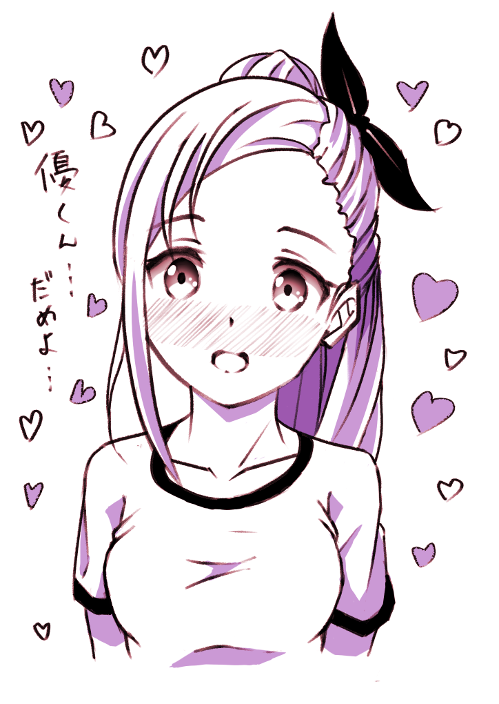 1girl blush breasts commentary_request cropped_torso forehead gym_shirt hair_ribbon heart kaguya-sama_wa_kokurasetai_~tensai-tachi_no_renai_zunousen~ kaze_makase koyasu_tsubame long_hair looking_at_viewer medium_breasts monochrome nose_blush open_mouth ponytail ribbon shirt short_sleeves sidelocks simple_background solo translation_request upper_body white_background