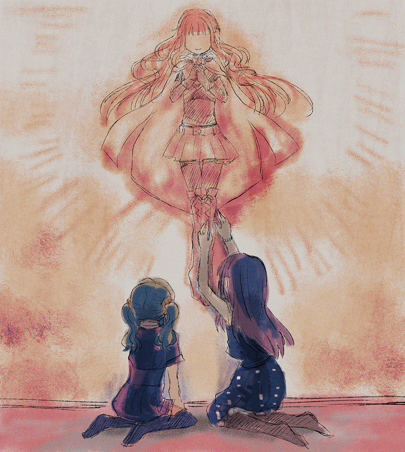 3girls aqua_hair arms_up backlighting belt black_dress black_legwear blue_hair blunt_bangs bodystocking boots bracelet cloak crop_top cross-laced_footwear dress faceless frilled_dress frills from_behind full_body futaba_sana gloves hair_down hands_on_another's_leg hands_on_ground hood hooded_cloak jewelry kneeling layered_sleeves long_hair long_sleeves looking_at_another magia_record:_mahou_shoujo_madoka_magica_gaiden magical_girl mahou_shoujo_madoka_magica miniskirt mizuna_girls'_academy_school_uniform multiple_girls mural nanami_yachiyo no_shoes own_hands_together pantyhose pink_hair pleated_skirt polka_dot polka_dot_dress purple_shirt purple_skirt school_uniform scrunchie seiza shirt shoelaces short_over_long_sleeves short_sleeves shorts shorts_under_skirt sidelocks sitting skirt smile tamaki_iroha thigh_boots thighhighs totte twintails very_long_hair wall wavy_hair white_sleeves yellow_scrunchie