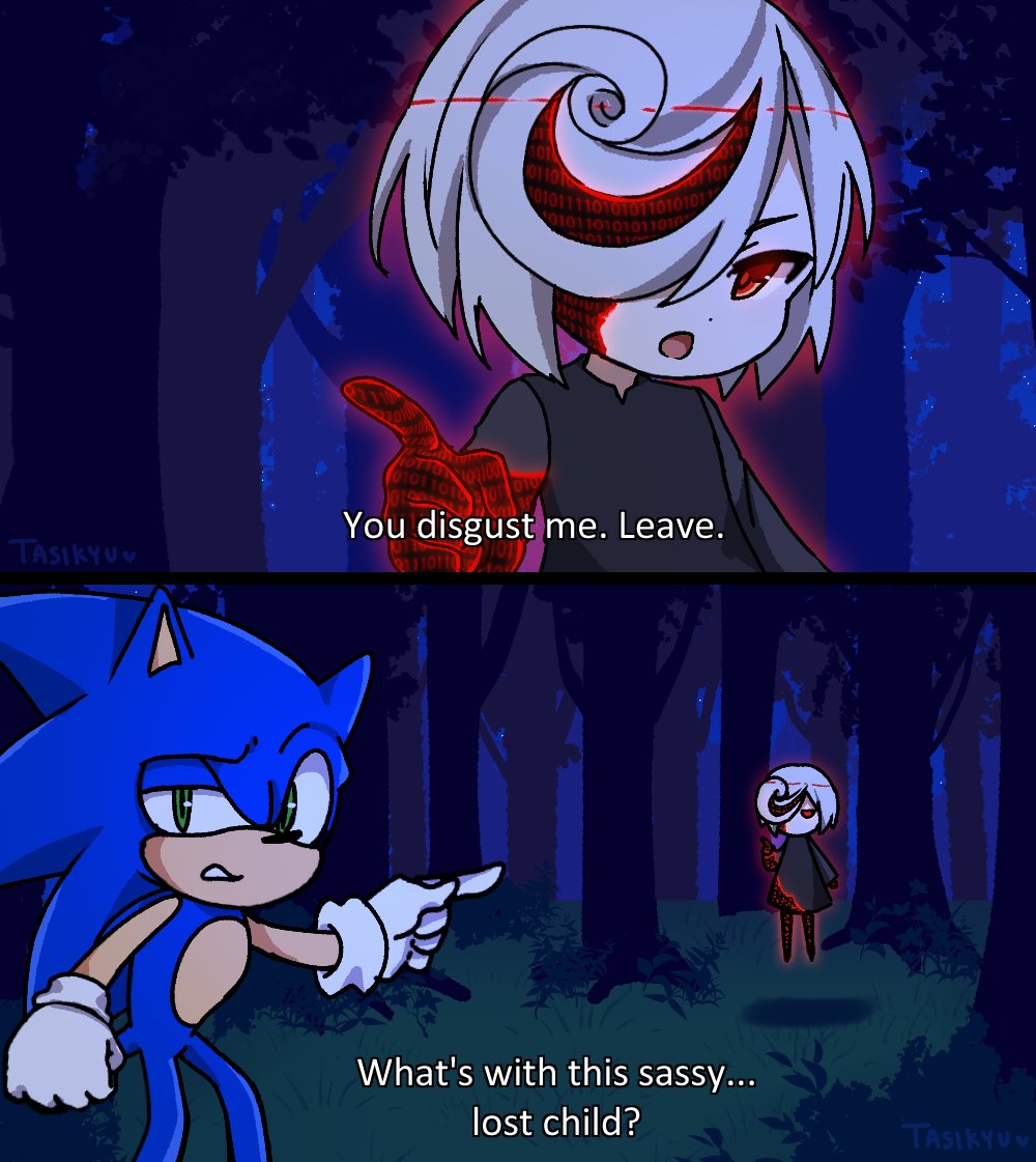 1boy 1girl english_text floating forest furry furry_male gloves green_eyes hair_over_one_eye half-closed_eye meme nature night one-punch_man open_mouth parody pointing pointing_at_another red_eyes sage_(sonic) sassy_lost_child_(meme) sky sonic_(series) sonic_frontiers sonic_the_hedgehog subtitled tasikyu tree white_gloves white_hair