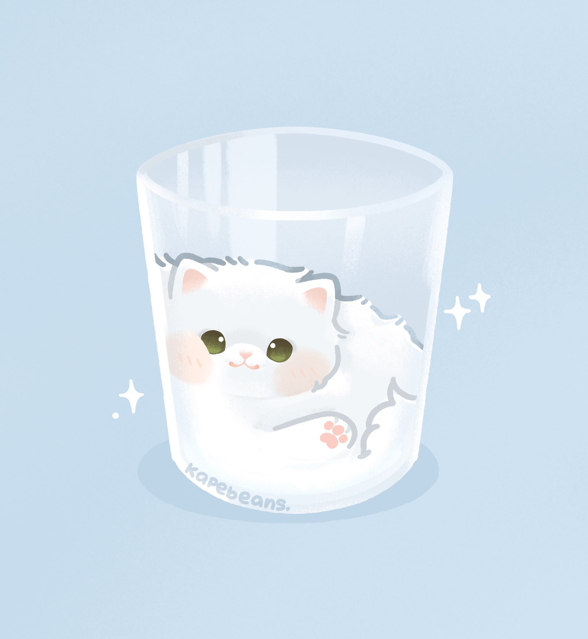 :3 animal animal_focus artist_name baby_animal blue_background cat closed_mouth commentary_request cup glass green_eyes highres kapebeansies kitten looking_at_viewer no_humans original shadow simple_background sparkle squishing