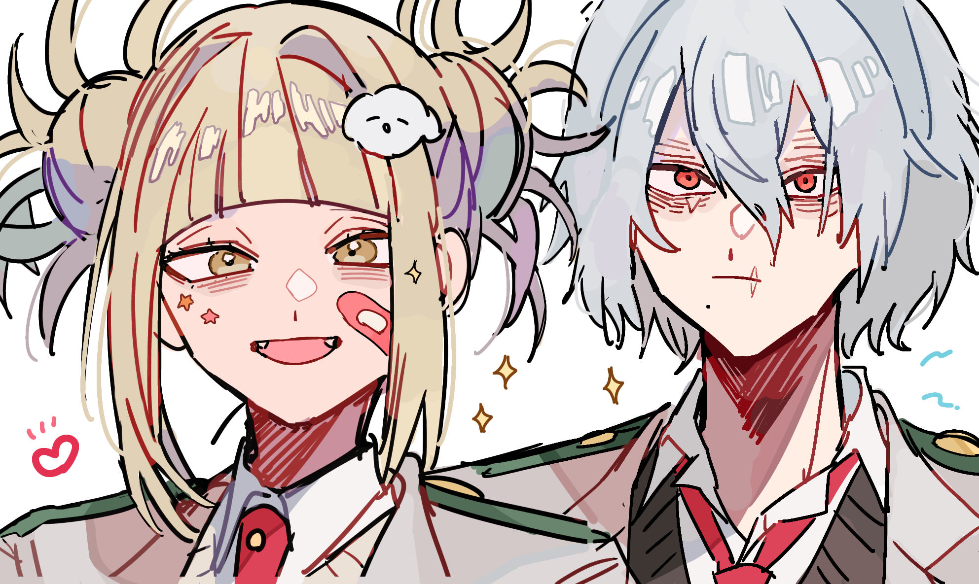 1boy 1girl :d bad_id bad_pixiv_id bags_under_eyes bandaid bandaid_on_cheek bandaid_on_face blonde_hair blunt_bangs boku_no_hero_academia closed_mouth collared_shirt double_bun empty_eyes expressionless facial_mark fangs hair_bun hair_ornament hairclip heart highres looking_at_viewer messy_hair mole mole_under_mouth open_mouth pale_skin portrait red_eyes scar scar_on_face scar_on_mouth school_uniform shigaraki_tomura shirt short_hair sidelocks simple_background smile sparkle toga_himiko u.a._school_uniform white_background white_shirt yellow_eyes yumei_(jigoku101)