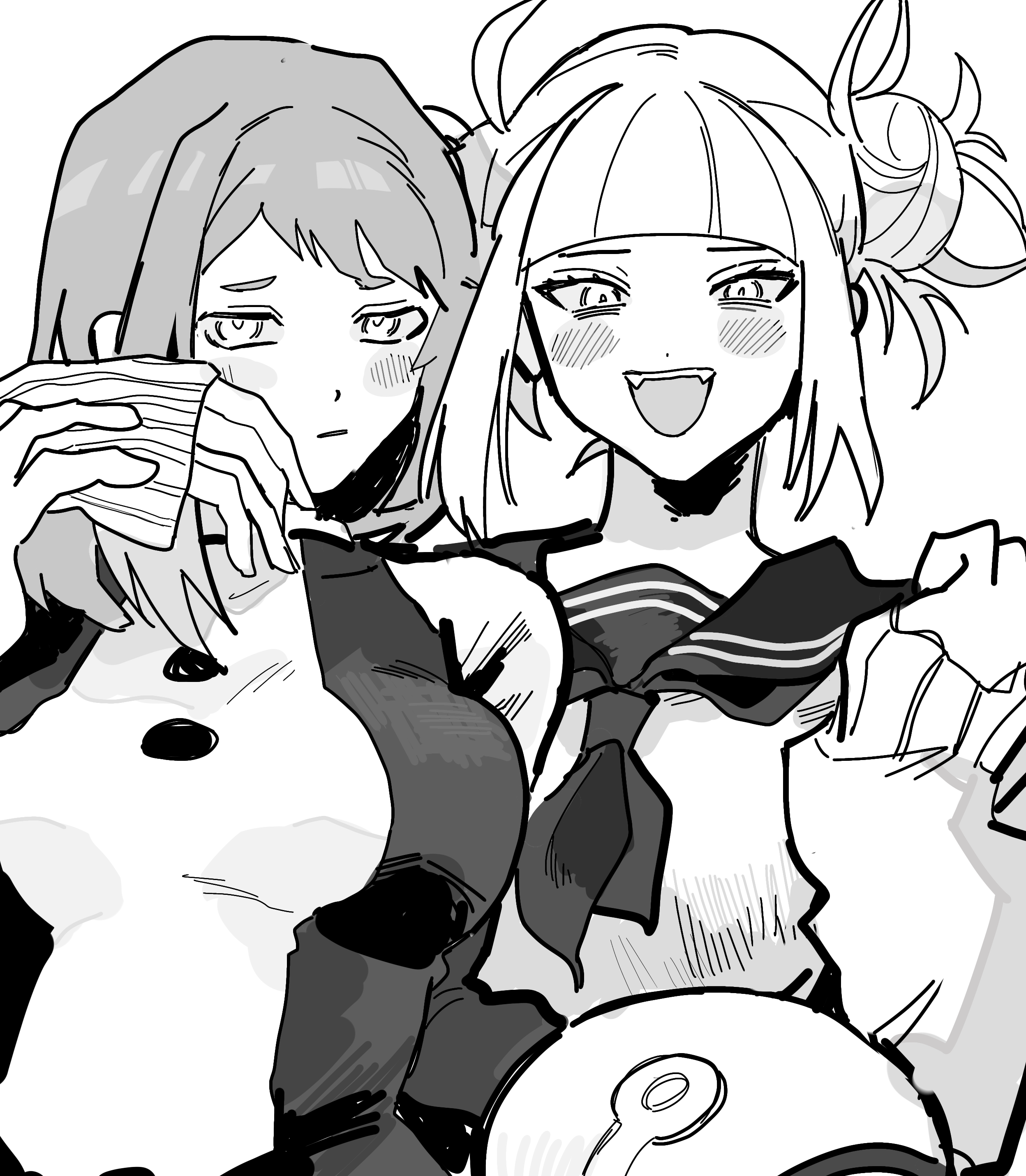 2girls :d absurdres arm_up bags_under_eyes blunt_bangs blush bodysuit boku_no_hero_academia breasts cardigan double_bun fangs furrowed_brow greyscale hair_bun highres holding_another's_wrist long_sleeves looking_at_viewer monochrome multiple_girls open_mouth parted_lips school_uniform short_hair sidelocks simple_background sleeves_past_wrists smile toga_himiko uraraka_ochako yumei_(jigoku101) yuri