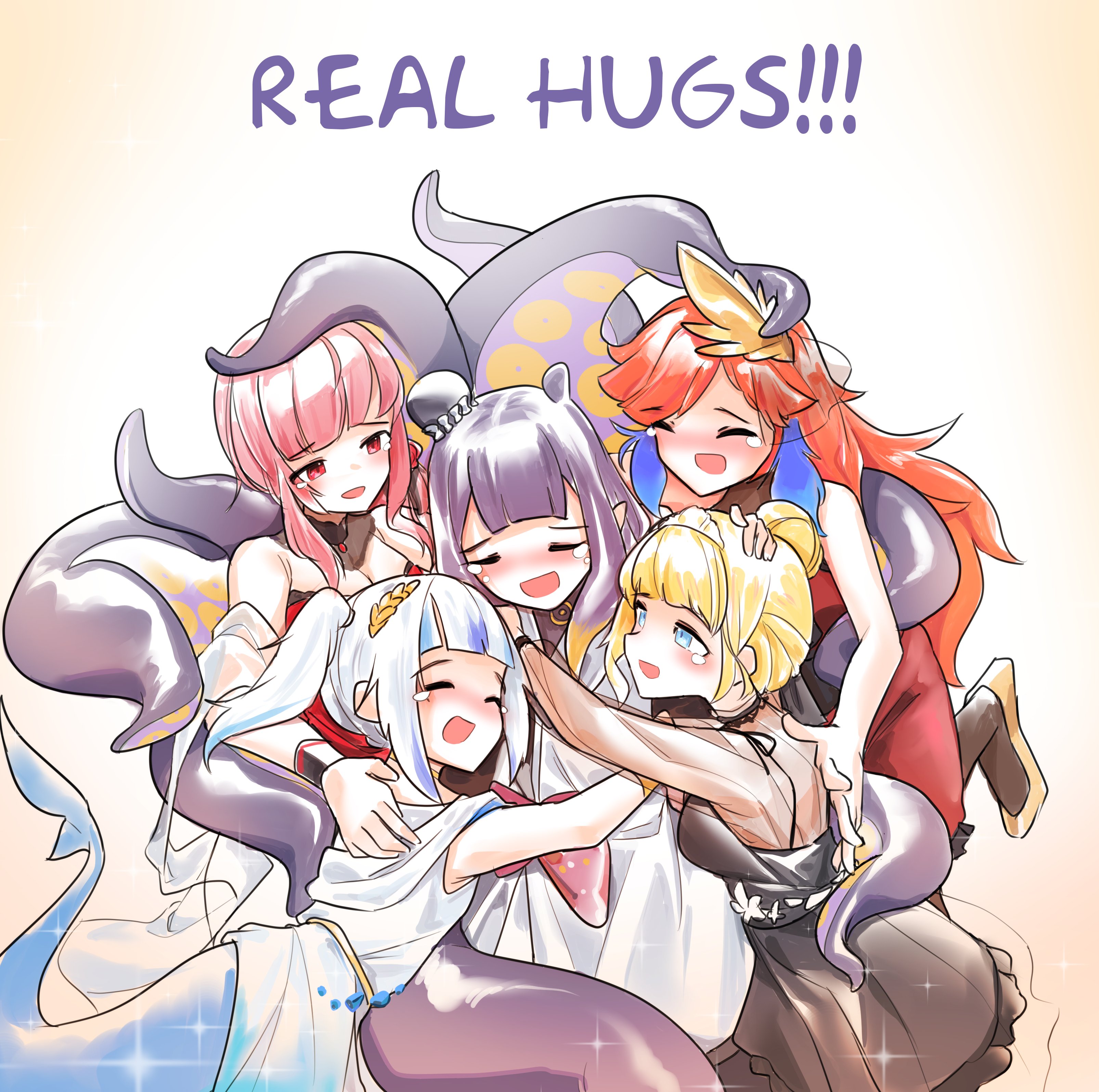absurdres blonde_hair blue_eyes blue_hair blunt_bangs blush dress earrings fins fish_tail gawr_gura group_hug highres hololive hololive_english holomyth hug jewelry long_hair mori_calliope multicolored_hair multiple_girls ninomae_ina'nis orange_hair pink_hair pointy_ears pompmaker1 purple_hair smile streaked_hair tail takanashi_kiara tears tentacle_hair tentacles toga virtual_youtuber watson_amelia