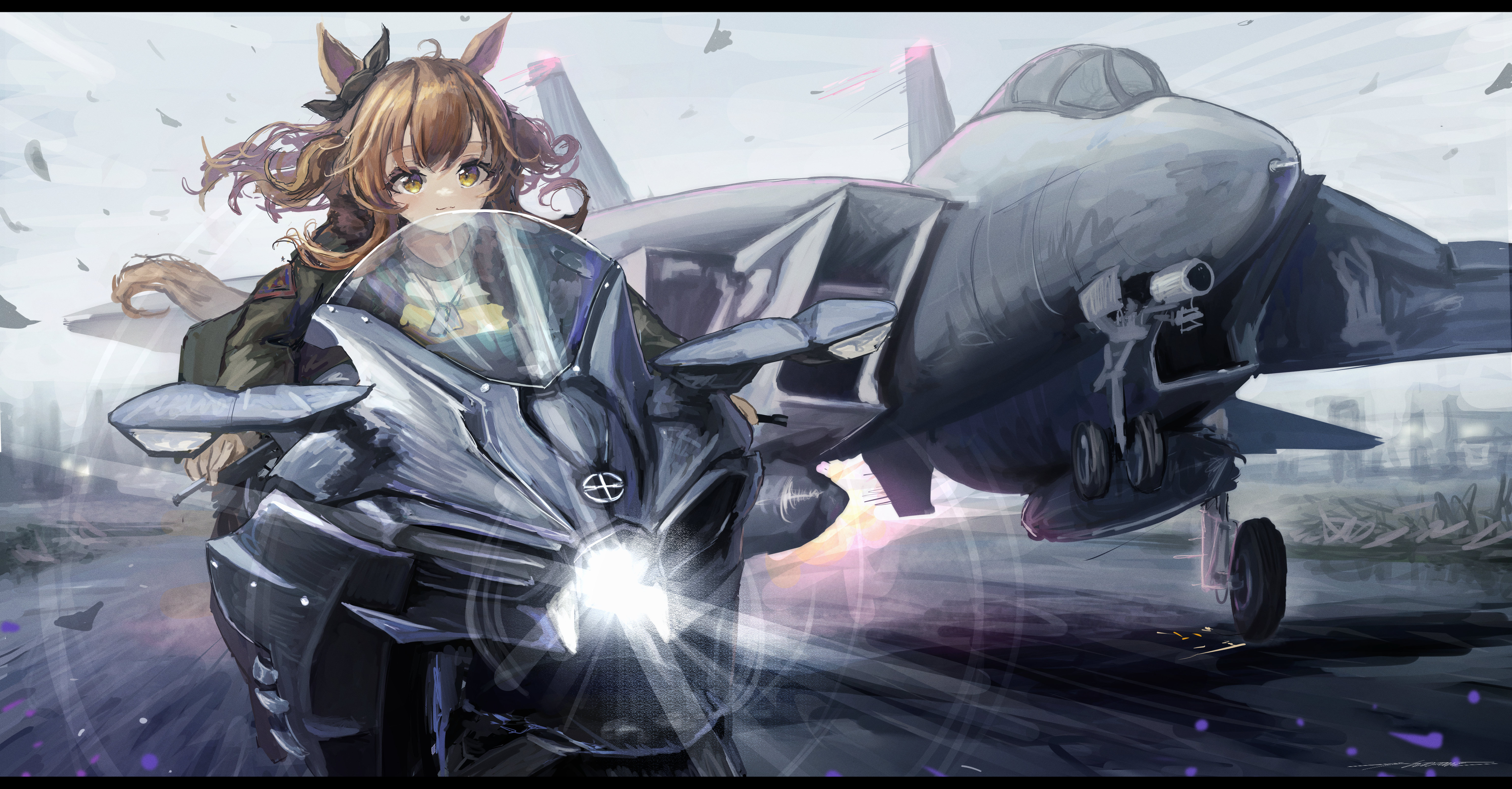 1girl absurdres aircraft airplane animal_ears bomber_jacket bow brown_ribbon commentary_request dog_tags ear_bow ear_ribbon eyebrows_hidden_by_hair f-14_tomcat fighter_jet fire green_jacket highres horse horse_girl horse_tail jacket kawasaki_(company) long_hair looking_ahead mayano_top_gun_(scramble_zone)_(umamusume) mayano_top_gun_(umamusume) military military_vehicle motion_lines motor_vehicle motorcycle on_motorcycle orange_eyes orange_hair ribbon road shirt shiyo_tsubame sparks speed_lines tail takeoff top_gun two_side_up umamusume unused_tire vehicle_focus vehicle_request yellow_shirt