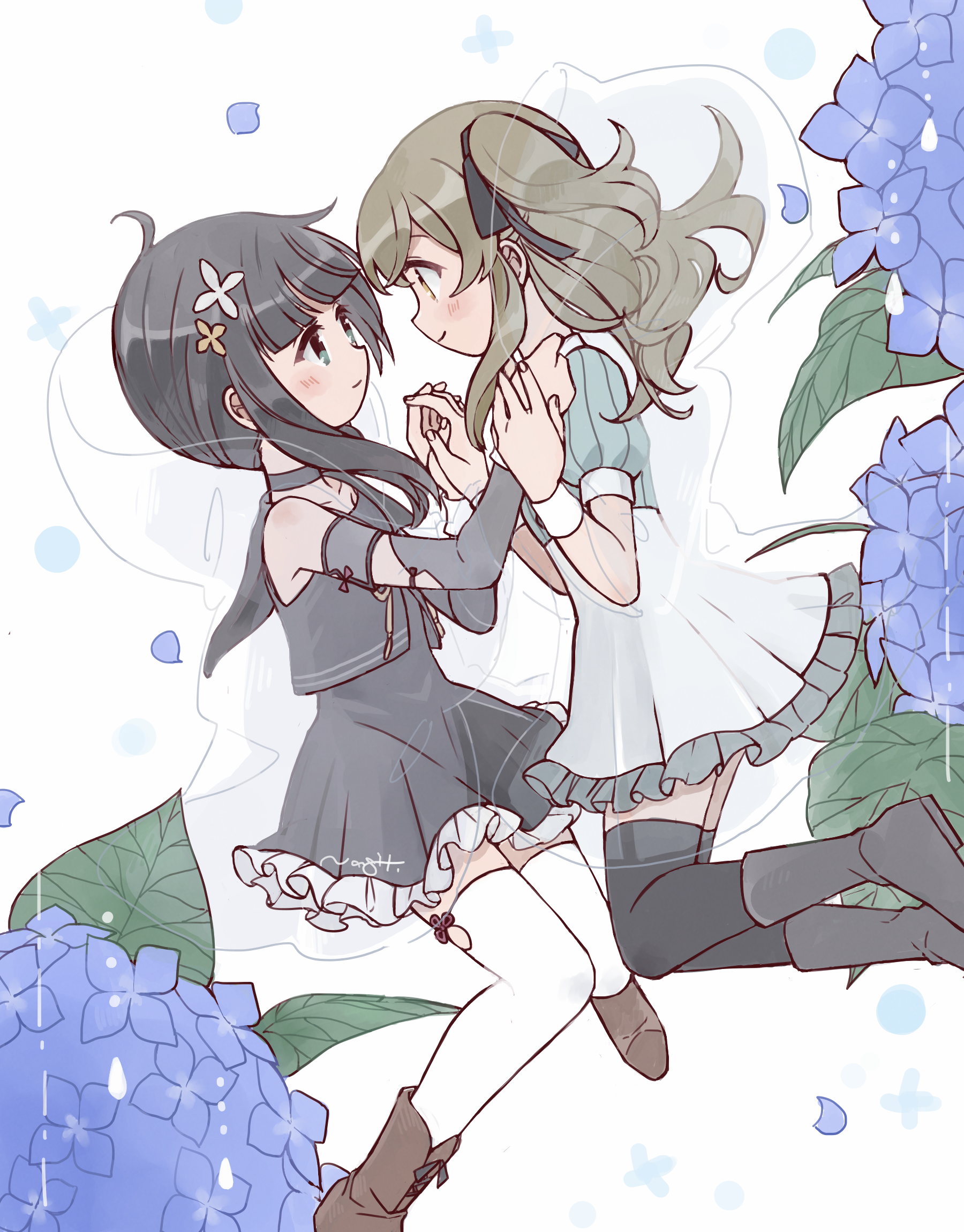 2girls ahoge artist_name assault_lily bare_shoulders black_choker black_footwear black_hair black_legwear black_ribbon blue_flower blunt_bangs blush boots brown_footwear choker closed_mouth collarbone commentary_request detached_sleeves dress eye_contact face-to-face falling_petals floating floating_hair floral_background flower frilled_dress frills from_side green_eyes hair_flower hair_ornament hair_ribbon hands_up highres holding_hands hood hood_up hooded_jacket jacket knees_together_feet_apart kuo_shenlin legs_up light_brown_hair long_hair long_sleeves looking_at_another multiple_girls nagi_(namae11x) one_side_up petals profile puffy_short_sleeves puffy_sleeves ribbon see-through_clothes see-through_jacket short_dress short_sleeves sidelocks sleeveless sleeveless_dress smile thighhighs wang_yujia water_drop white_background white_dress white_flower white_legwear wrist_cuffs yellow_eyes yellow_flower yuri zettai_ryouiki