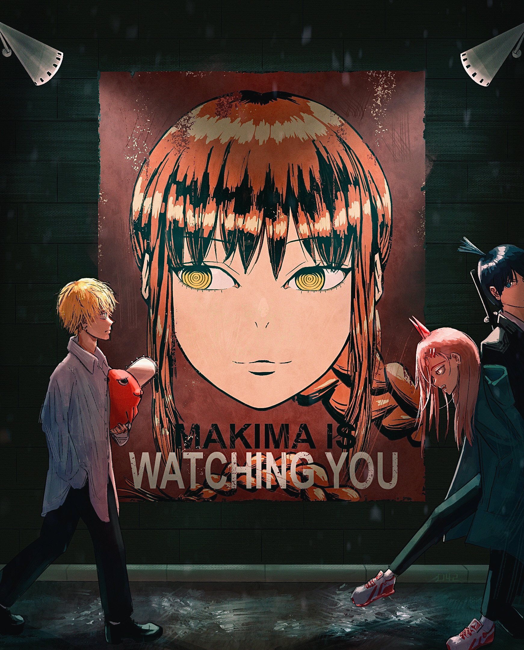 1984_(novel) 1other 2boys 2girls big_brother_(1984) black_hair blonde_hair braid braided_ponytail chainsaw_man denji_(chainsaw_man) english_text hayakawa_aki highres holding long_hair looking_away makima_(chainsaw_man) multiple_boys multiple_girls orange_hair parody piroshikinta pochita_(chainsaw_man) poster_(object) propaganda ringed_eyes road shirt shoes short_hair source_quote_parody street wall white_shirt yellow_eyes