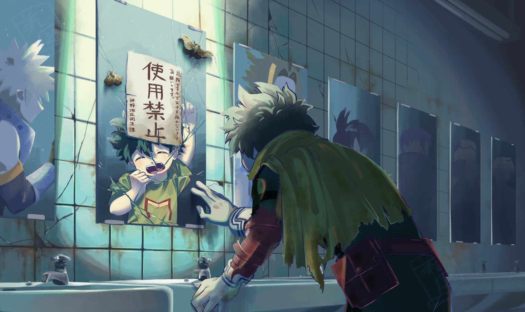 1girl 6+boys arm_up bakugou_katsuki bathroom belt blonde_hair bodysuit boku_no_hero_academia broken_mirror bug cape child clenched_hands closed_eyes crack cracked_wall different_reflection en_(boku_no_hero_academia) faucet freckles gloves goggles goggles_on_head green_bodysuit green_hair green_shirt highres indoors insect lariat_(boku_no_hero_academia) male_focus midoriya_izuku mirror moth multiple_boys niwa2wa_tori open_mouth red_belt reflection shimura_nana shinomori_hikage shirt short_hair short_sleeves sink spiked_hair spoilers tile_wall tiles torn_cape torn_clothes translation_request white_gloves yagi_toshinori yellow_cape