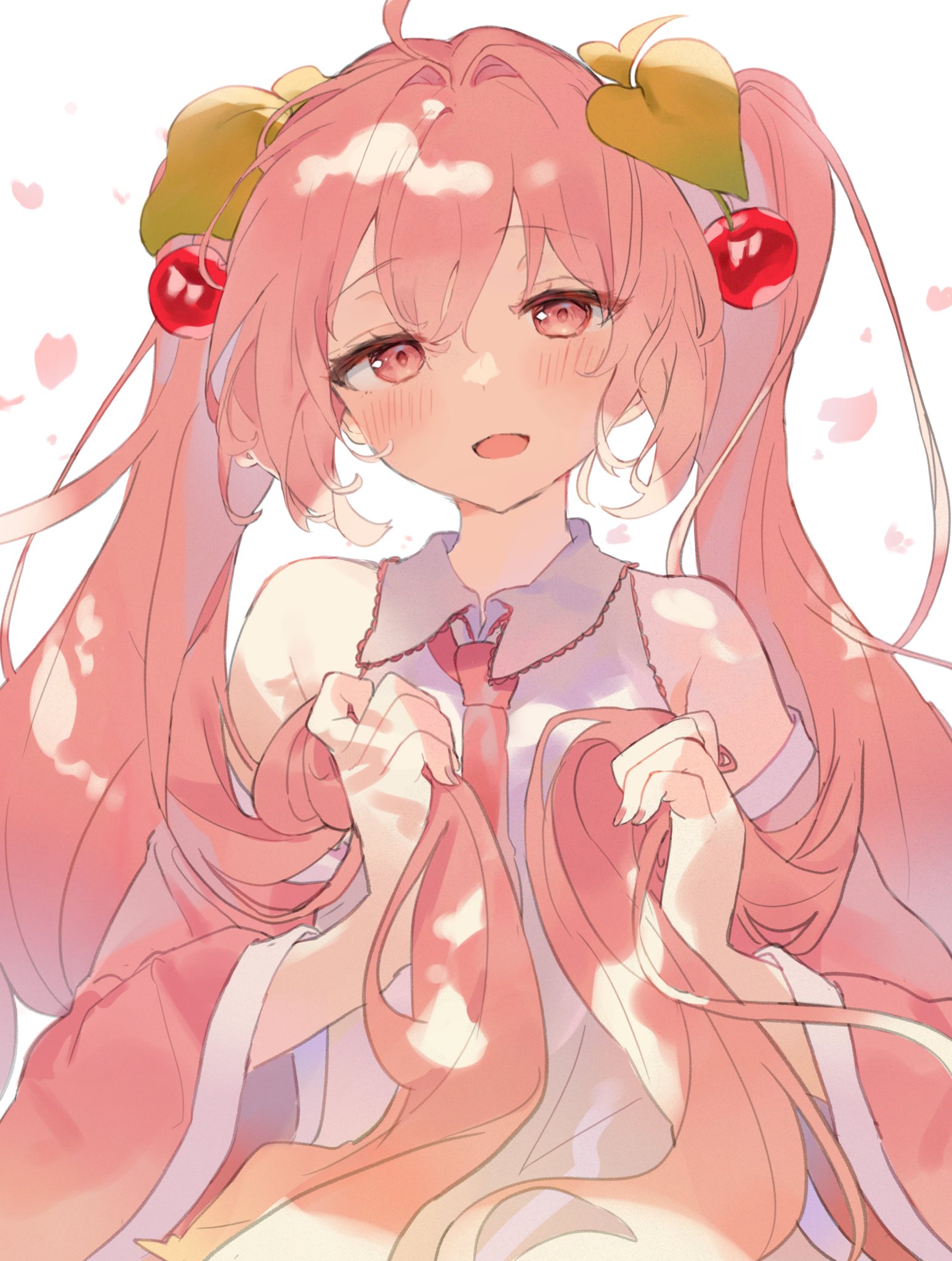 1girl alternate_color blush bunchi cherry_hair_ornament collared_shirt commentary_request detached_sleeves food-themed_hair_ornament hair_ornament hatsune_miku highres holding holding_own_hair long_hair looking_at_viewer necktie open_mouth pink_hair pink_necktie pink_sleeves sakura_miku shirt sleeveless sleeveless_shirt solo twintails upper_body very_long_hair vocaloid white_shirt