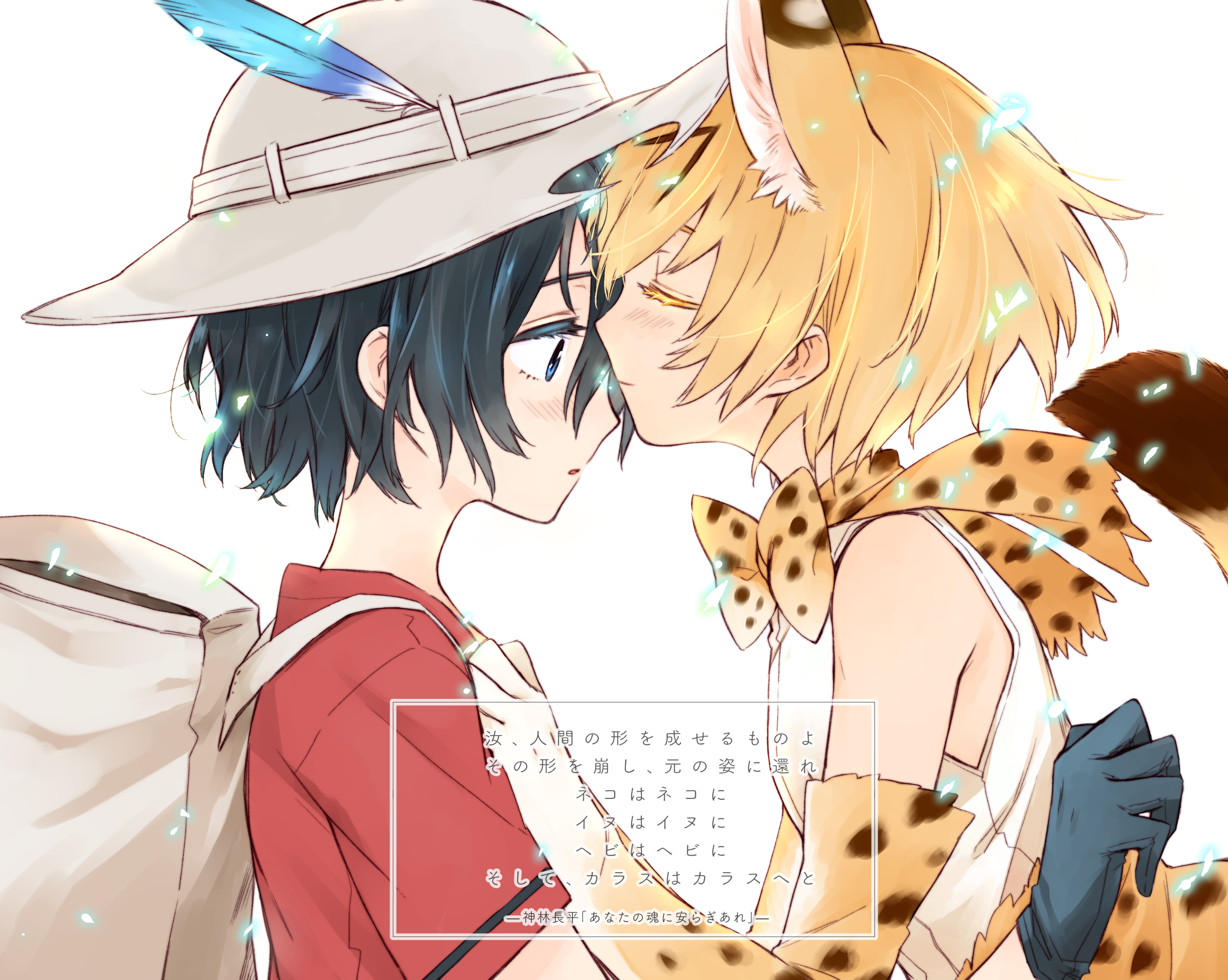 2girls animal_ear_fluff animal_ears animal_print backpack bag black_hair blonde_hair blue_eyes blush bow bowtie bun_no_nagi cat_ears cat_tail closed_eyes colored_eyelashes elbow_gloves from_side gloves hands_on_another's_chest hat hat_feather highres hug kaban_(kemono_friends) kemono_friends kiss kissing_forehead multiple_girls parted_lips profile serval_(kemono_friends) shirt short_hair short_sleeves sleeveless sleeveless_shirt smile t-shirt tail tail_raised translation_request yuri