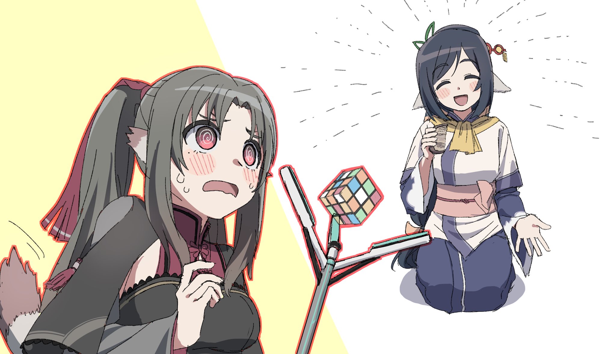 2girls @_@ absurdly_long_hair aged_up ainu_clothes animal_ears aquaplus arm_up black_hair blush breasts cait_sith_(utawarerumono:_lost_flag) closed_eyes comb cowboy_shot dress hair_ornament hair_ribbon highres holding holding_comb kneeling kuon_(utawarerumono) layered_sleeves long_hair long_sleeves long_twintails looking_at_another low-tied_long_hair medium_breasts mole mole_under_eye multiple_girls nekone_(utawarerumono) open_mouth parted_bangs raised_eyebrows ribbon sash scarf sidelocks swept_bangs tail twintails utawarerumono utawarerumono:_itsuwari_no_kamen utawarerumono:_lost_flag very_long_hair wavy_mouth wide-eyed yellow_scarf yo_(artist)