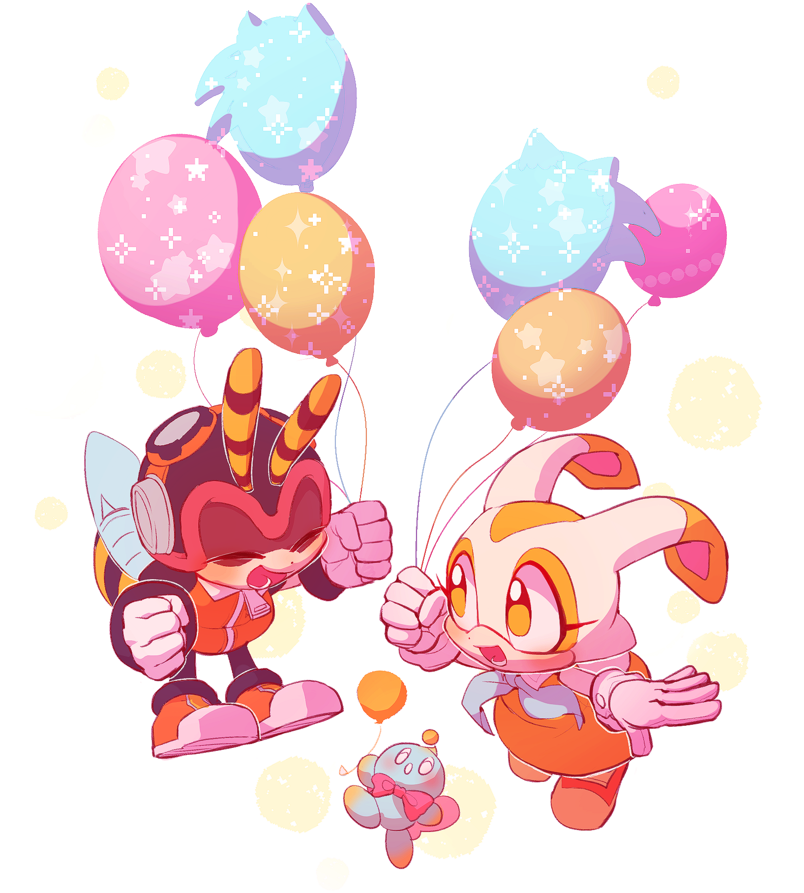 1boy 1girl :d balloon charmy_bee cheese_(sonic) closed_eyes cream_the_rabbit dress full_body furry furry_female furry_male gloves happy highres holding holding_balloon open_mouth orange_dress pyungsyu simple_background smile sonic_(series) white_gloves zipper_pull_tab