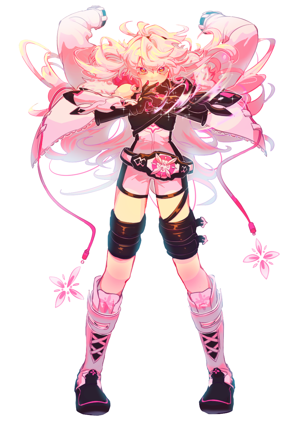 1girl black_hairband boots closed_mouth elsword full_body hairband highres jacket jacket_on_shoulders laby_(elsword) long_hair looking_at_viewer pyungsyu simple_background smile solo standing thigh_strap white_background