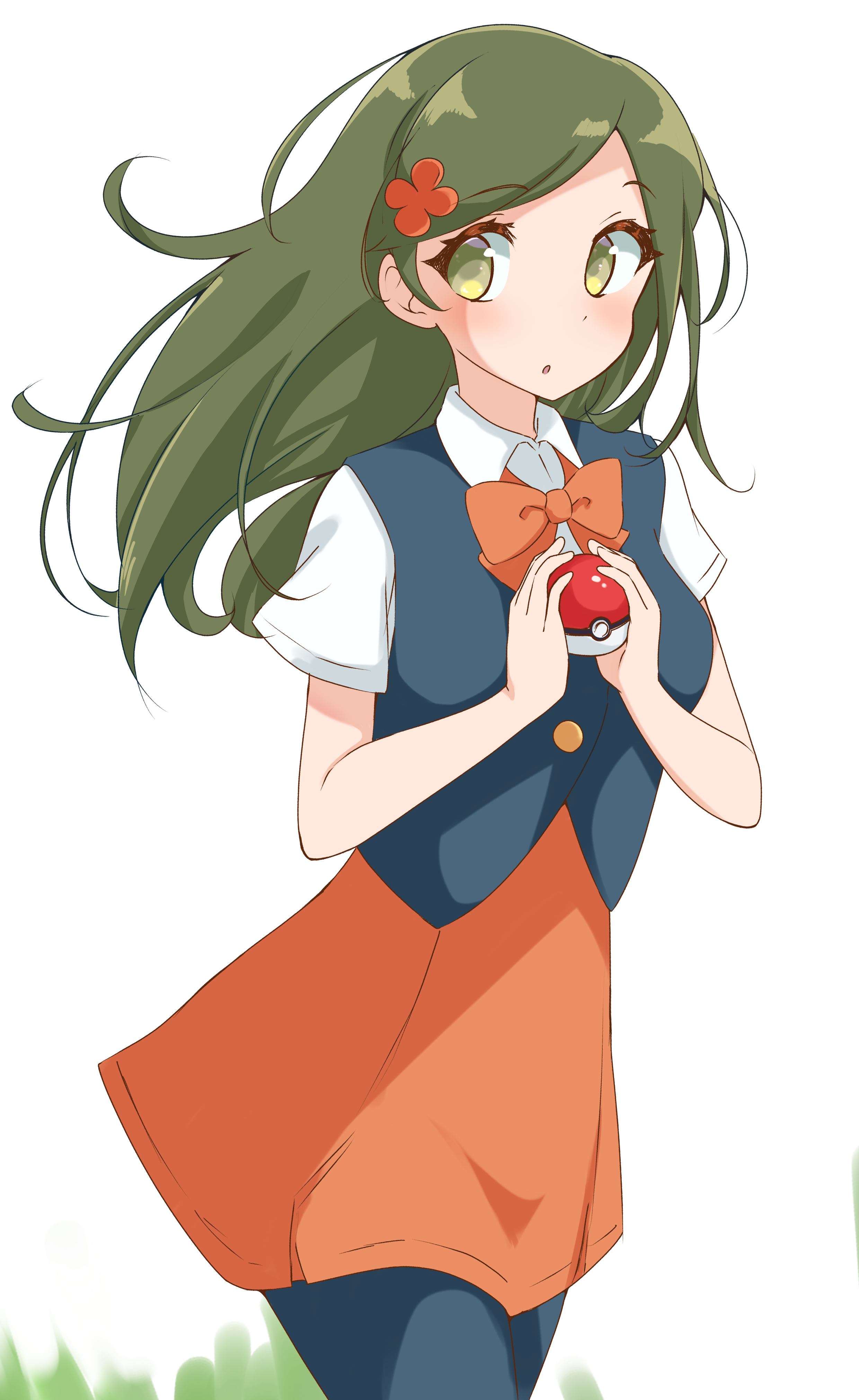 1girl absurdres blue_vest bow collared_shirt flower green_eyes green_hair hair_flower hair_ornament highres holding holding_poke_ball lass_(pokemon) lass_(pokemon_bdsp) long_hair looking_to_the_side nintendo poke_ball pokemon pokemon_brilliant_diamond_and_shining_pearl shirt skirt solo sugimura_mickey vest white_background white_shirt