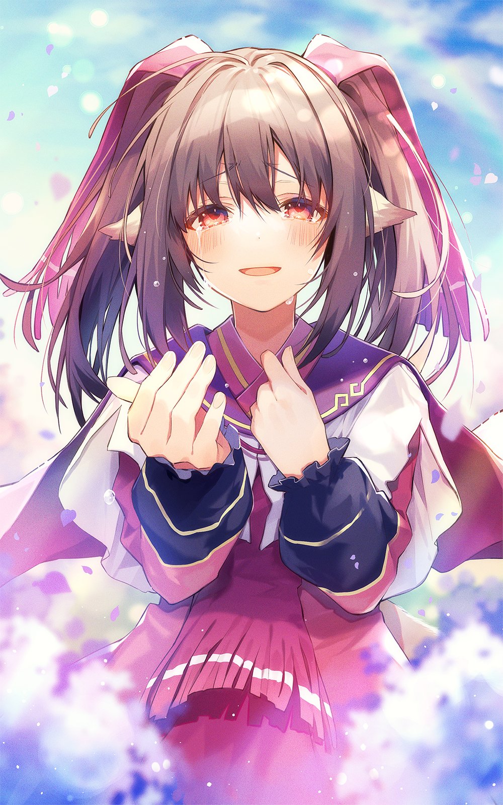 1girl ainu_clothes animal_ears aquaplus arms_up breasts brown_hair crying crying_with_eyes_open dress fingernails gradient_eyes gradient_hair hair_ribbon highres long_hair long_sleeves looking_at_viewer multicolored_eyes multicolored_hair nekone_(utawarerumono) official_art open_mouth oshioshio raised_eyebrows red_eyes ribbon sidelocks small_breasts solo tail teardrop tears twintails upper_body utawarerumono utawarerumono:_itsuwari_no_kamen utawarerumono:_lost_flag