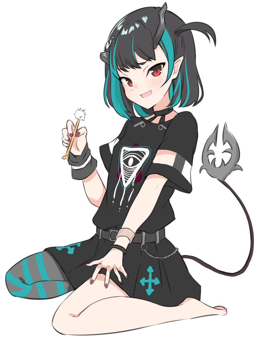 1girl barefoot belt black_belt black_dress black_hair blue_hair blue_thighhighs blush breasts commentary_request demon_girl demon_horns demon_tail dress eye_of_providence full_body grey_thighhighs horns kaito_(kaito921125) lap_pillow_invitation looking_at_viewer mimikaki multicolored_hair nail_polish nanashi_inc. official_alternate_costume one_side_up open_mouth pointy_ears red_eyes red_nails shishio_chris shishio_chris_(3rd_costume) short_hair simple_background single_thighhigh sitting small_breasts smile solo striped_clothes striped_thighhighs tail thighhighs two-tone_hair virtual_youtuber wariza white_background