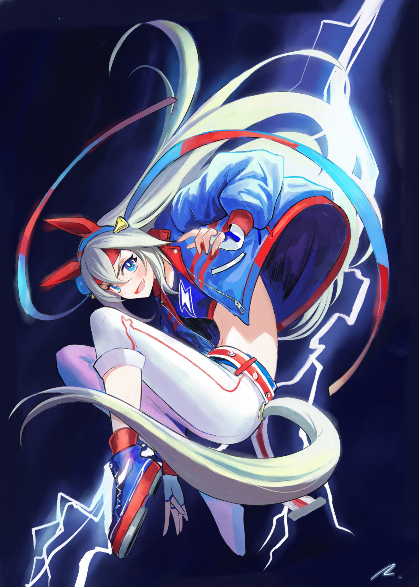 1girl animal_ears belt blue_eyes blue_jacket blue_shirt crop_top fingerless_gloves full_body gloves grey_hair hairband headband highres horse_ears horse_girl horse_tail jacket lightning long_hair long_sleeves looking_at_viewer midriff navel open_clothes open_jacket open_mouth pants rosette_(roze-ko) shirt shoes signature smile sneakers solo tail tamamo_cross_(umamusume) umamusume white_gloves white_pants
