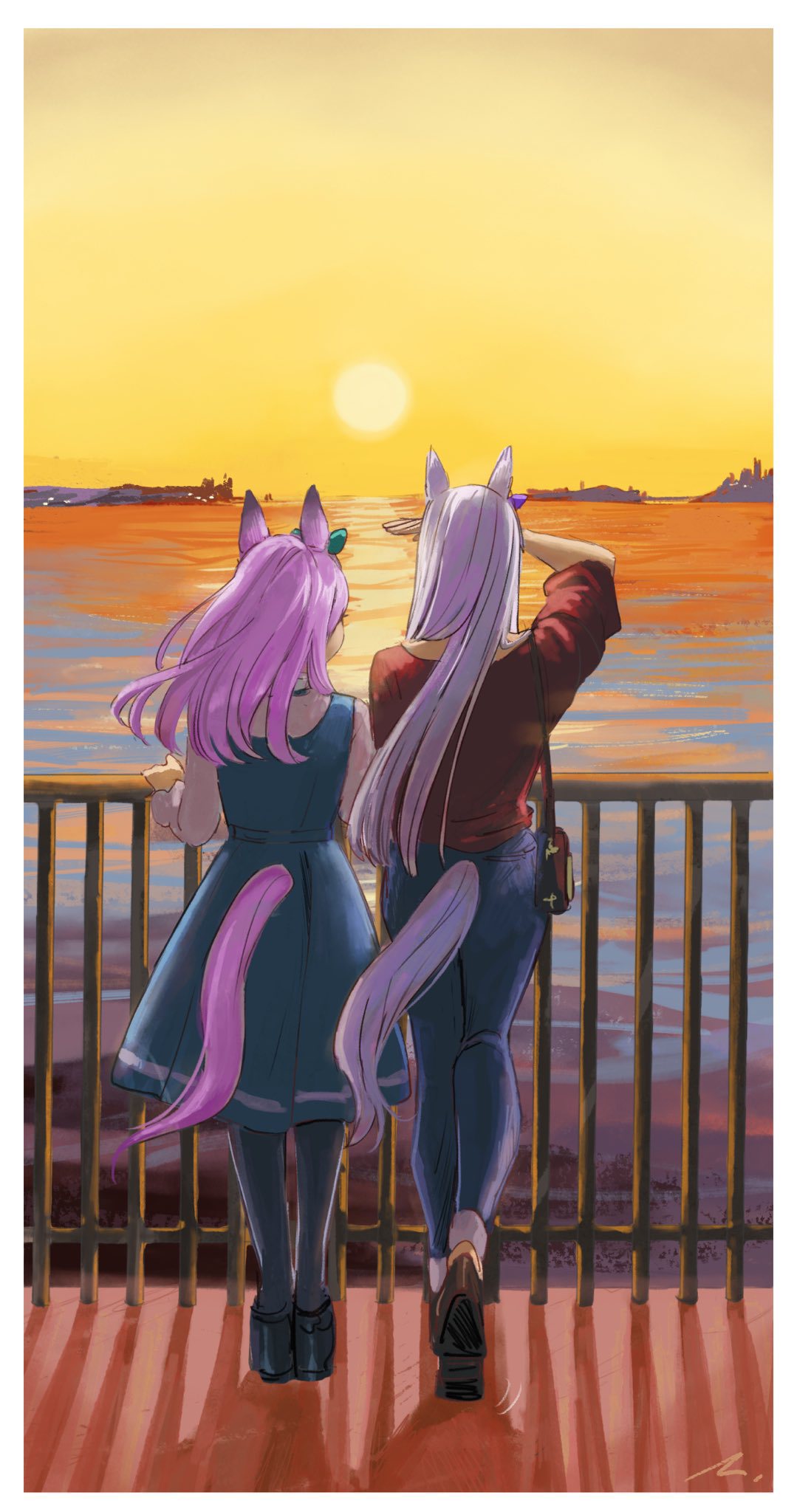 2girls animal_ears arm_up bag black_legwear blue_pants denim dress from_behind full_body gold_ship_(umamusume) green_dress grey_hair handbag heel_up highres horizon horse_ears horse_girl horse_tail jeans long_hair long_sleeves mejiro_mcqueen_(umamusume) motion_lines multiple_girls ocean outdoors pants pinafore_dress purple_hair railing red_shirt rosette_(roze-ko) shading_eyes shirt shoes signature sleeveless_dress standing sunset tail umamusume water