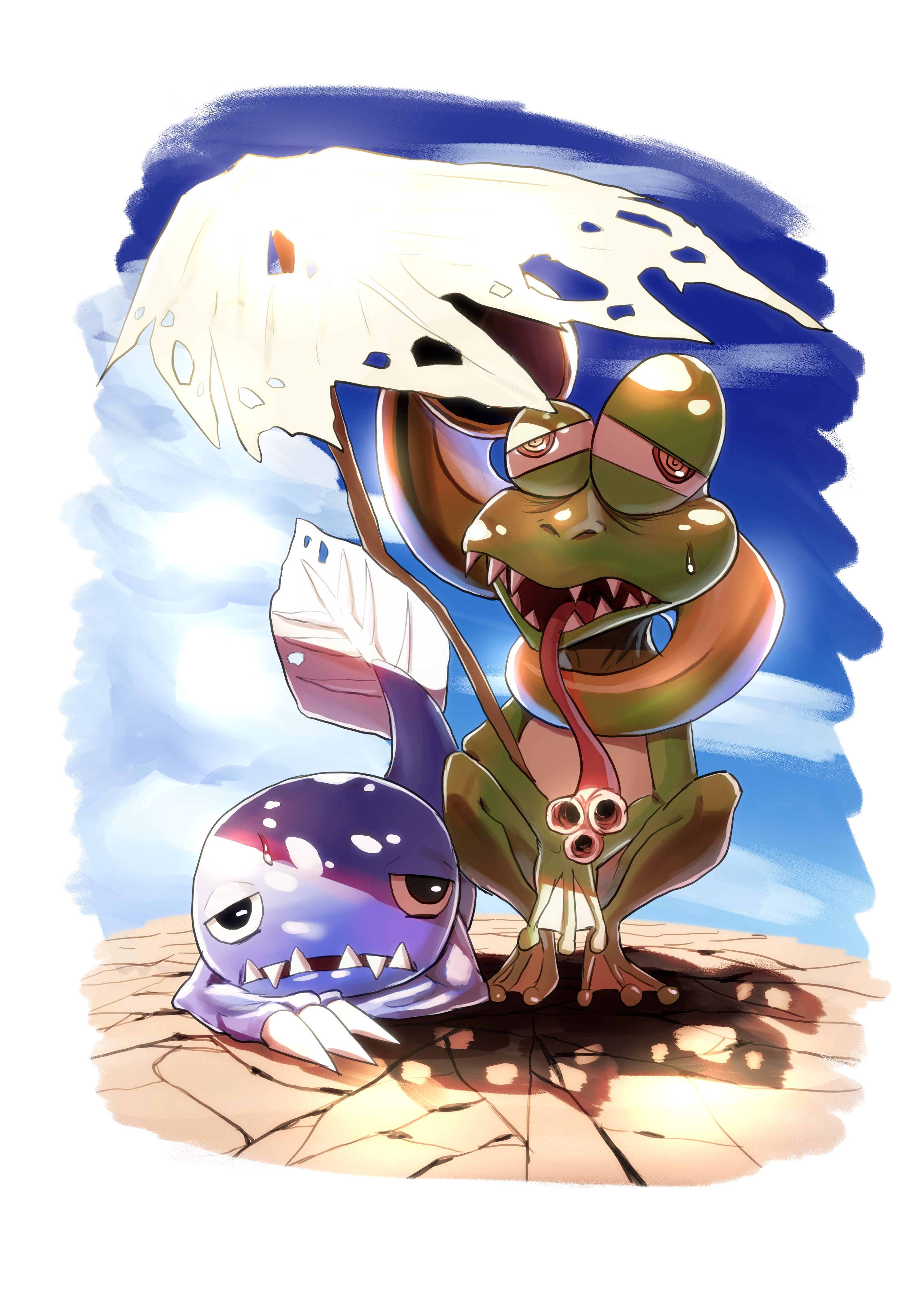 absurdres desert digimon frog gekomon highres otamamon shadow sharp_teeth sweat tadpole teeth