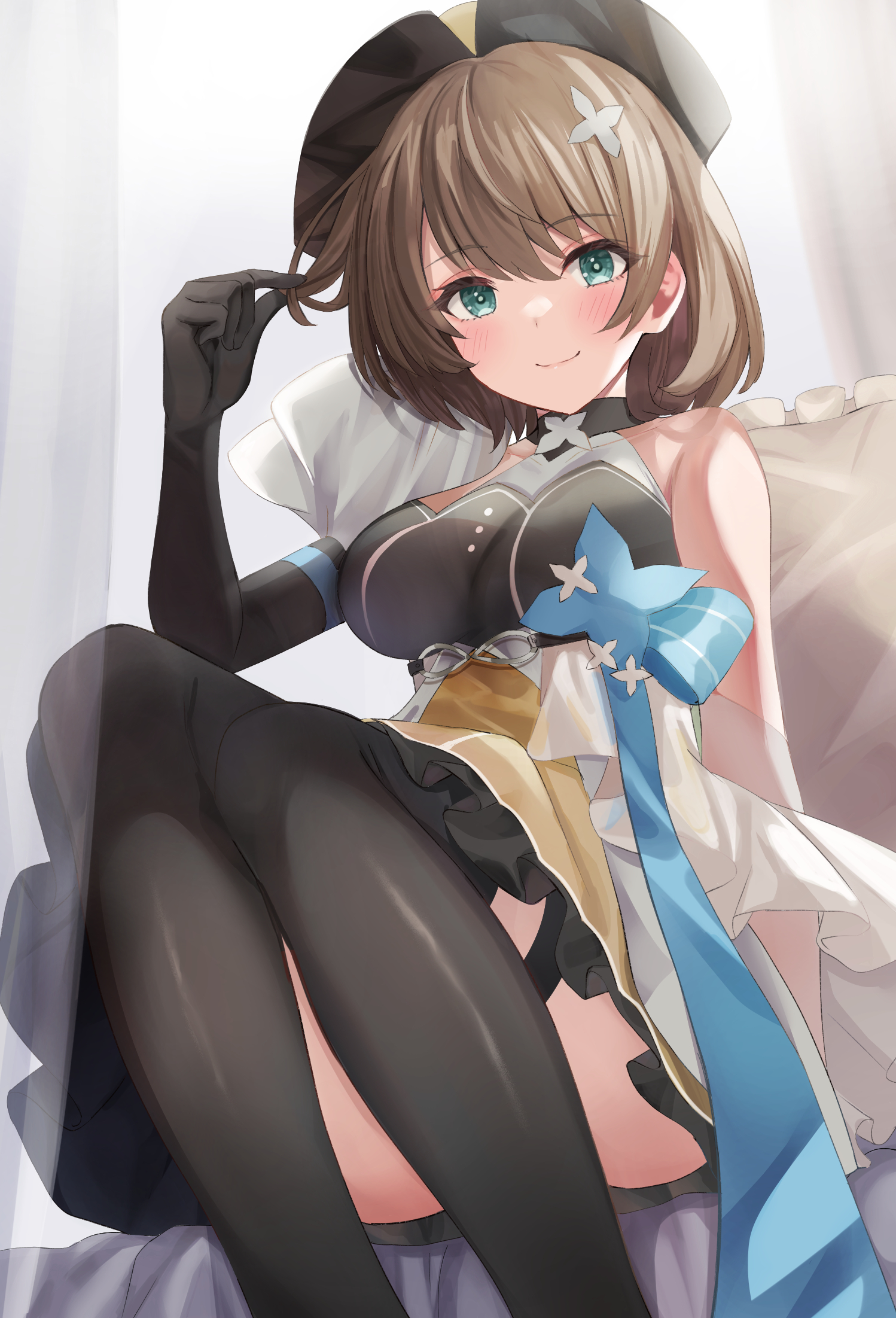 1girl aogiri_koukou aqua_eyes asymmetrical_gloves black_thighhighs blush breasts brown_hair gloves hat highres kurikoma_komaru looking_at_viewer medium_breasts mismatched_gloves short_hair smile solo thighhighs toratora_(nanahaba) virtual_youtuber