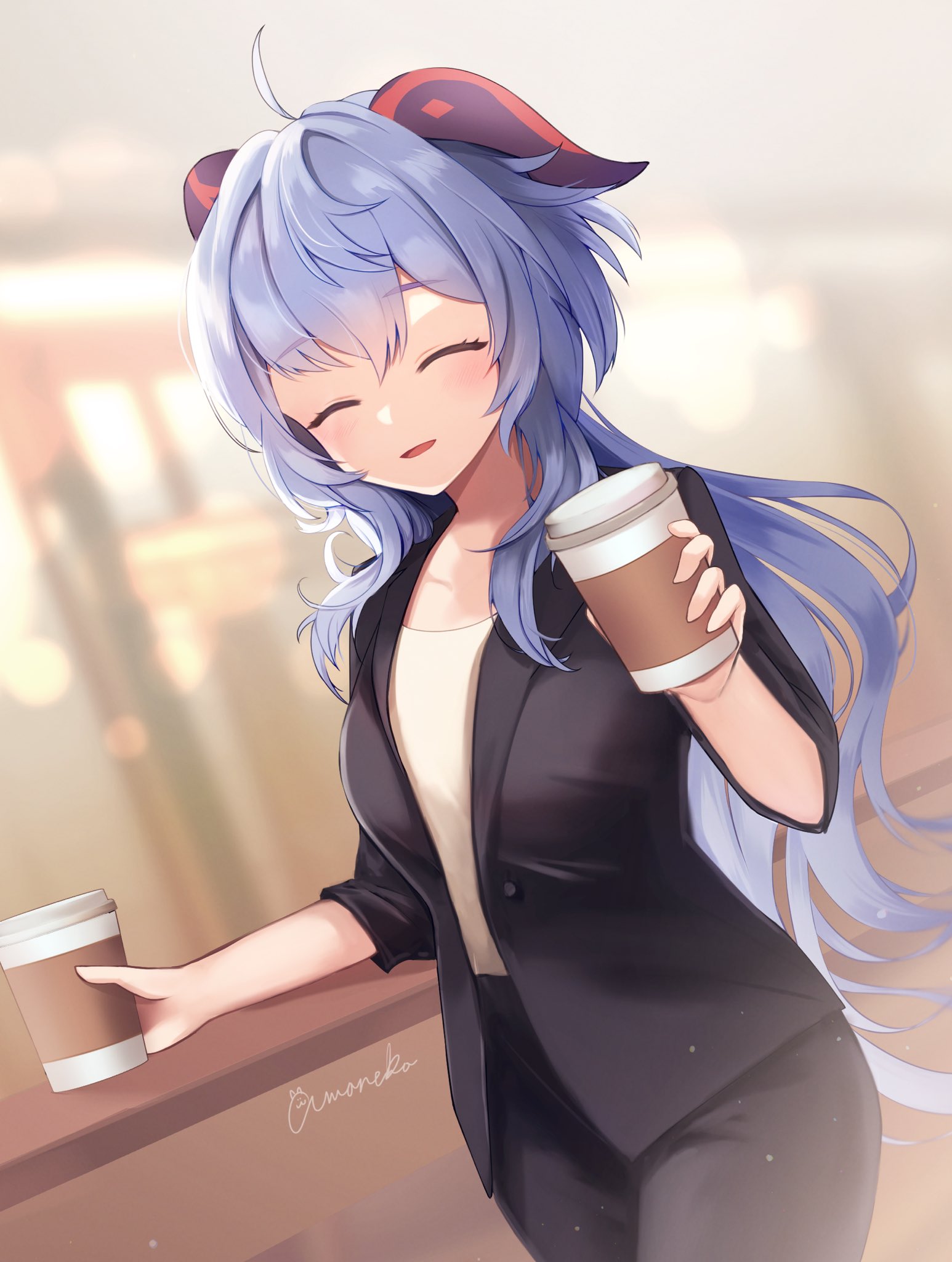 1girl ahoge alternate_costume amaneko_(amaneko_y) black_skirt blue_hair blush business_suit closed_eyes coffee cup disposable_cup formal_clothes ganyu_(genshin_impact) genshin_impact highres horns incoming_drink long_hair looking_at_viewer office_lady open_mouth pencil_skirt shirt sidelocks signature skirt smile solo suit