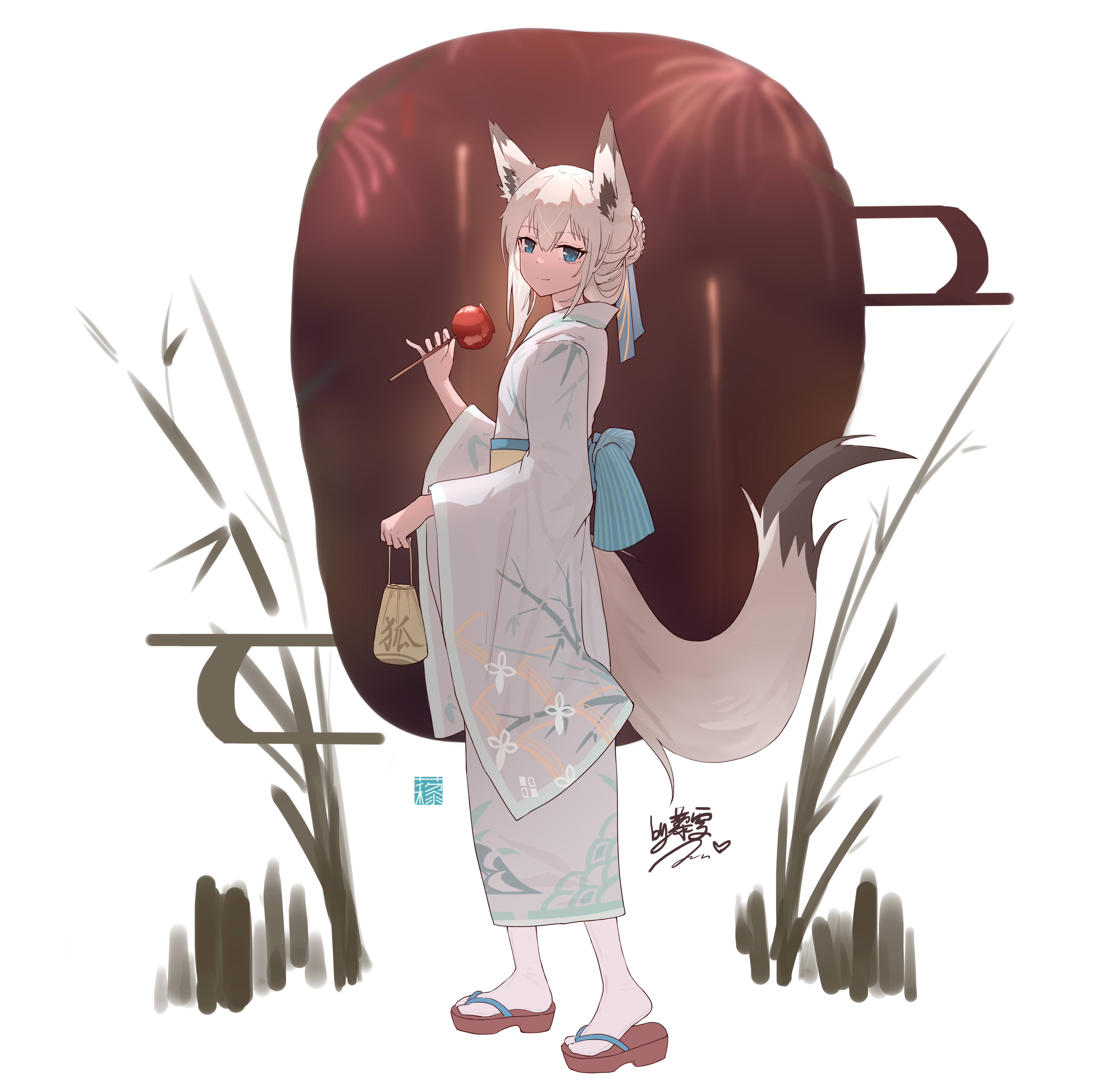1girl absurdres ahoge alternate_costume alternate_hairstyle animal_ears azur_lane bag blue_eyes braid braided_bun candy_apple commentary_request dual_wielding food fox_ears fox_girl fox_tail from_side full_body grey_hair hair_between_eyes hair_bun highres holding holding_food japanese_clothes kawakaze_(azur_lane) kimono liwendala long_hair long_sleeves looking_at_viewer obi sash sidelocks signature simple_background smile solo standing tail wide_sleeves yukata
