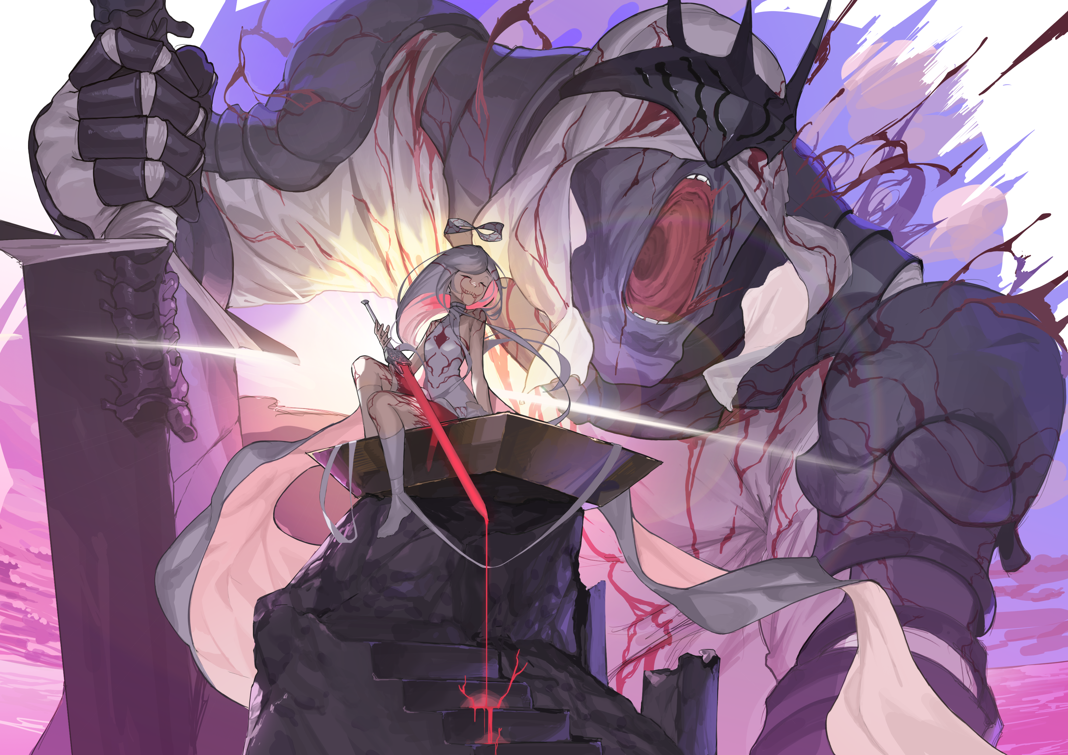1girl absurdres armor bare_shoulders blood blood_on_clothes blood_sword bloody_tears body_markings branch closed_mouth colored_skin crack dress dripping closed_eyes facial_mark glowing glowing_sword glowing_weapon grey_hair grey_skin halo highres holding holding_sword holding_weapon johnny-chan long_hair monster multicolored_hair no_shoes open_mouth original pauldrons pink_hair screaming shoulder_armor smile spine stairs sword teeth turtleneck two-tone_hair very_long_hair weapon white_dress white_footwear