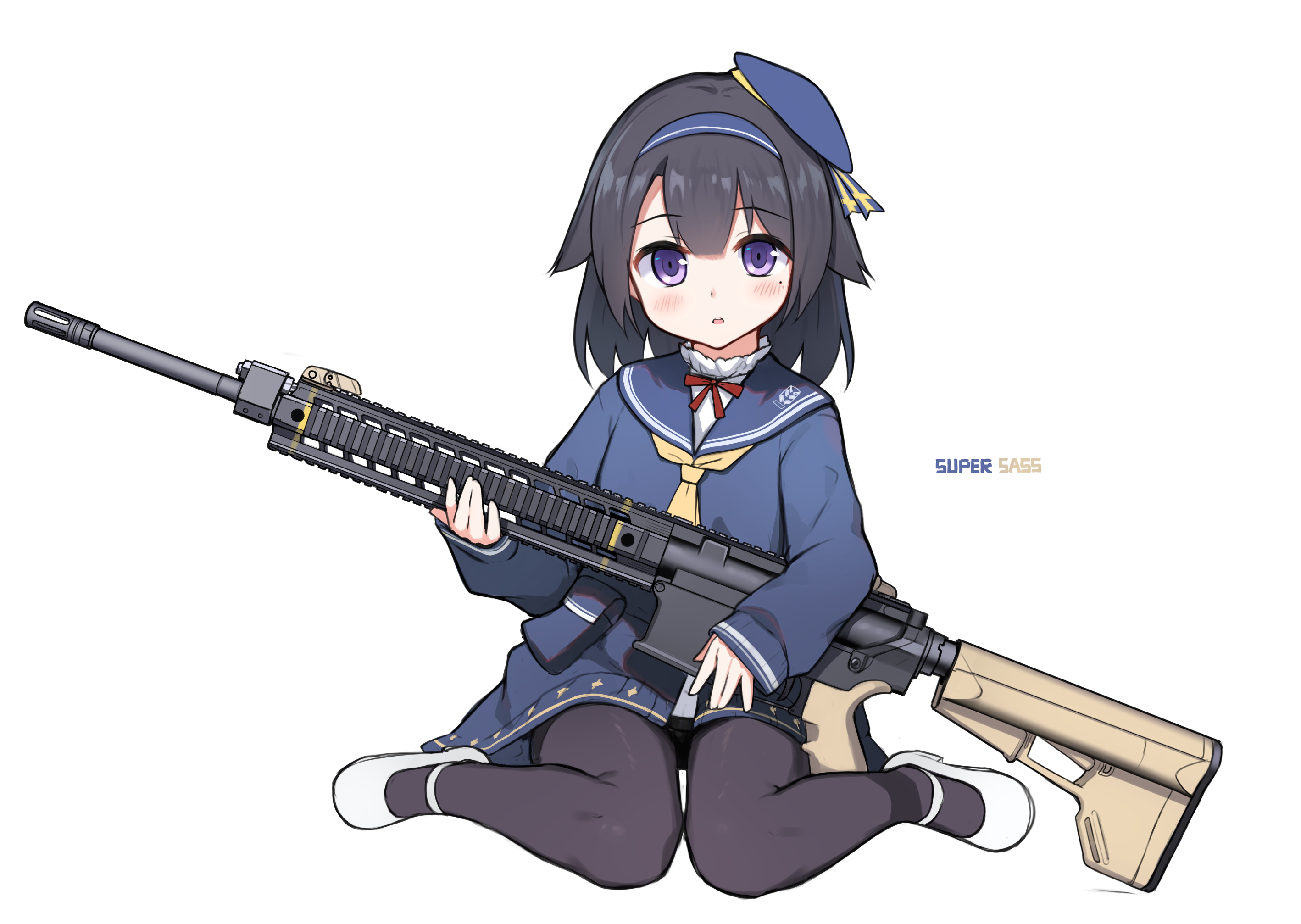1girl aged_down black_hair black_pantyhose blue_hairband blue_headwear blue_sailor_collar blue_shirt blue_skirt bow character_name commentary full_body girls'_frontline gun hagi_(ame_hagi) hair_flaps hairband hat highres looking_at_viewer name_connection neckerchief object_namesake open_mouth pantyhose purple_eyes red_bow sailor_collar shirt shoes short_hair simple_background sitting skirt solo super_sass super_sass_(girls'_frontline) teeth wariza weapon white_background white_shoes yellow_neckerchief