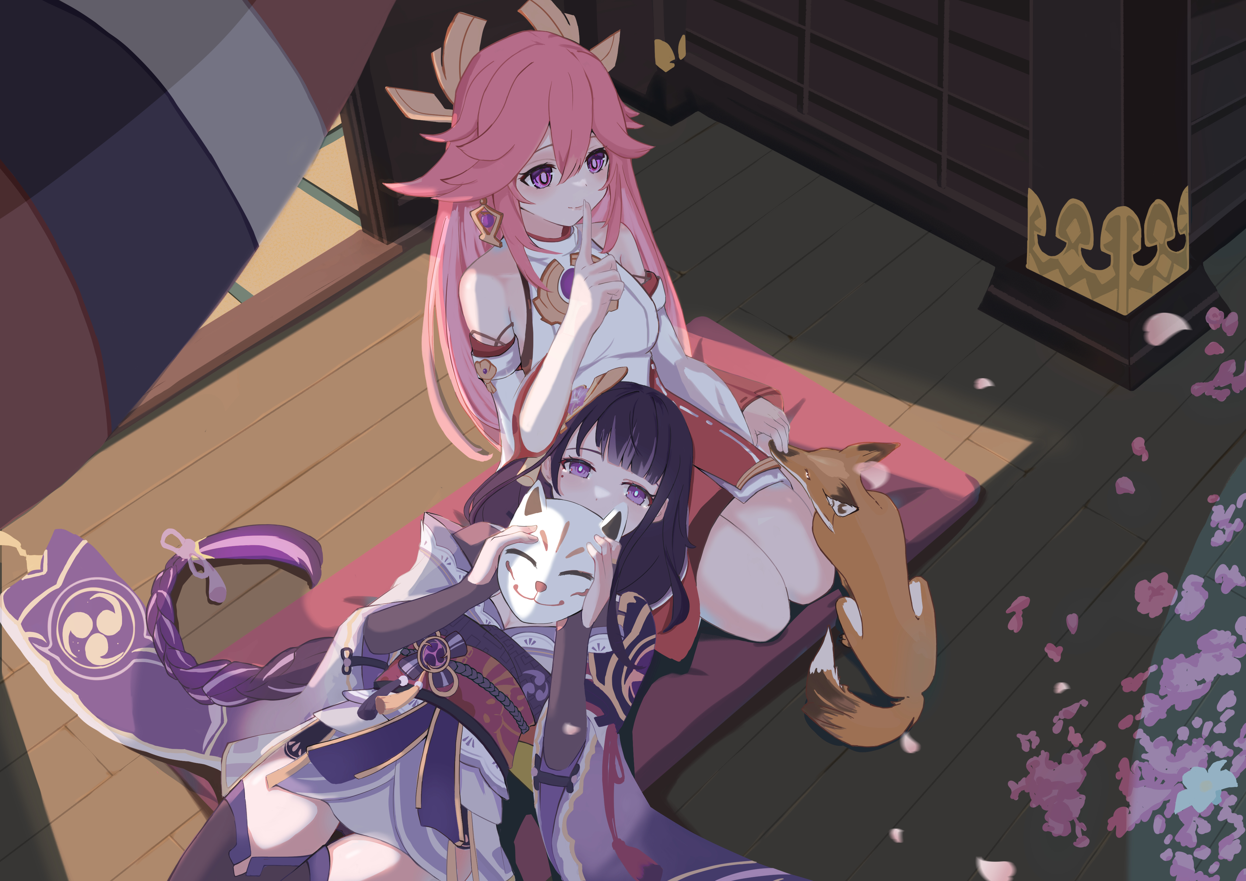 absurdres animal_ears architecture asahiv blunt_bangs bow braid breasts bridal_gauntlets cherry_blossoms cleavage commentary_request covering_own_mouth detached_sleeves earrings east_asian_architecture finger_to_mouth fox fox_ears fox_girl fox_mask from_above genshin_impact hair_between_eyes hair_bow hair_ornament hair_ribbon highres holding holding_mask japanese_clothes jewelry long_hair long_sleeves looking_at_viewer looking_up low-tied_long_hair low_ponytail lying_on_lap lying_on_person mask mitsudomoe_(shape) mole mole_under_eye nontraditional_miko obi petals pink_hair ponytail purple_eyes purple_hair raiden_shogun ribbon ribbon-trimmed_sleeves ribbon_trim rope sash shimenawa shrine sidelocks single_braid tatami thighhighs tomoe_(symbol) vision_(genshin_impact) wide_sleeves wooden_floor yae_miko zettai_ryouiki
