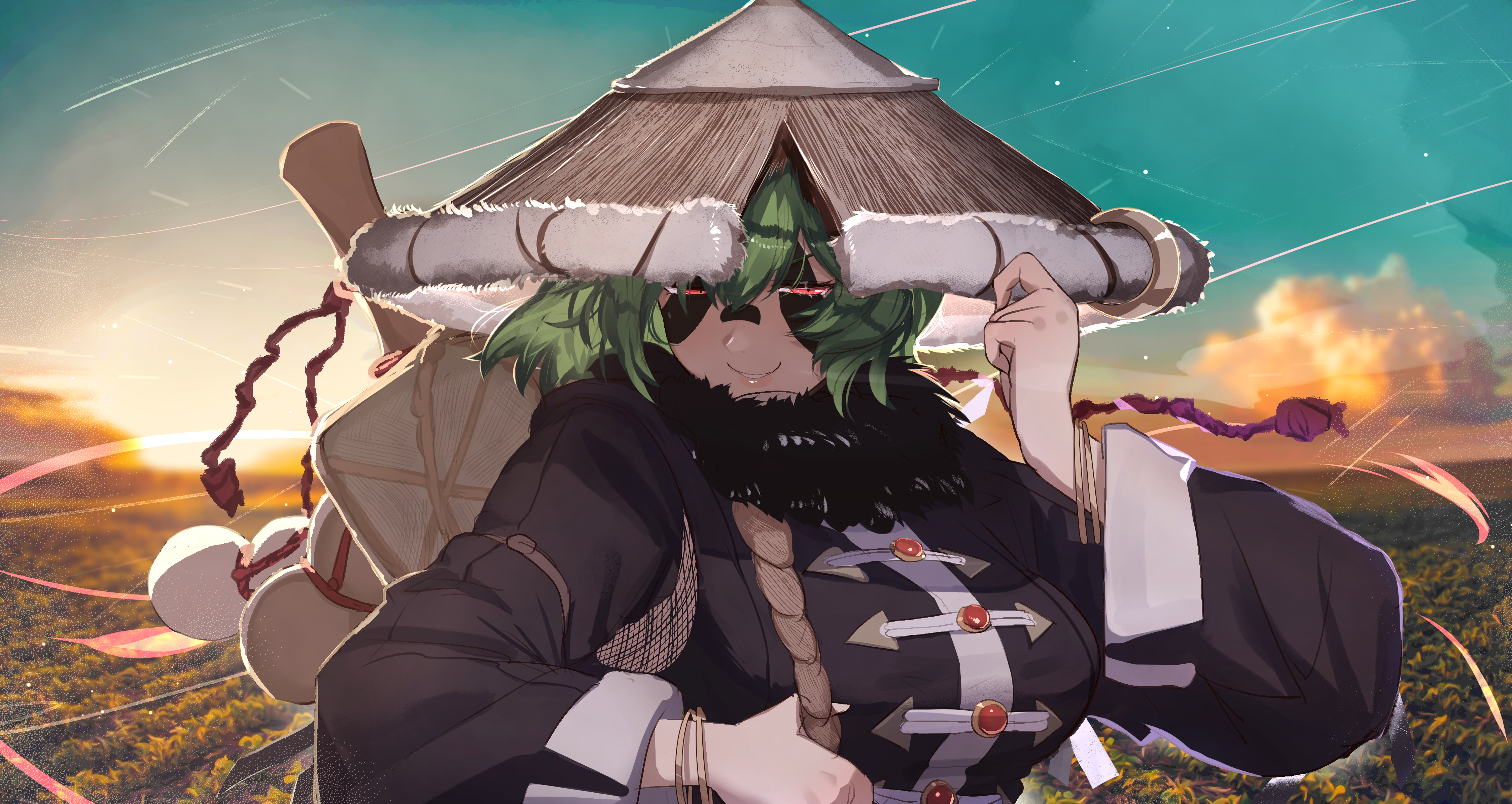 1girl absurdres alternate_costume arm_up backlighting black_coat blurry blurry_background bracelet breasts buttons carrying cloud coat commission facial_mark feather_collar field from_side fur-trimmed_headwear fur_trim gourd green_hair hair_between_eyes half-closed_eyes hand_on_headwear hat highres jewelry kazami_yuuka kikimifukuri large_breasts light_particles lips long_sleeves looking_at_viewer outdoors pink_lips pom_pom_(clothes) red_eyes rice_hat rope short_hair skeb_commission sky smile smirk solo straw_hat sunset tassel touhou upper_body warcraft wind world_of_warcraft