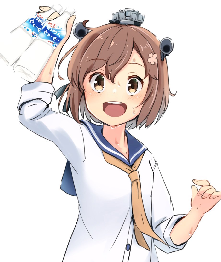 1girl bad_id bad_twitter_id black_legwear blue_sailor_collar bottle brown_eyes brown_hair commentary_request dress headgear headset kantai_collection ludens_(inonaka_koubou) neckerchief open_mouth round_teeth sailor_collar sailor_dress short_hair simple_background sleeves_rolled_up smile solo speaking_tube_headset sweater teeth upper_body upper_teeth_only white_background yellow_neckerchief yukikaze_(kancolle)