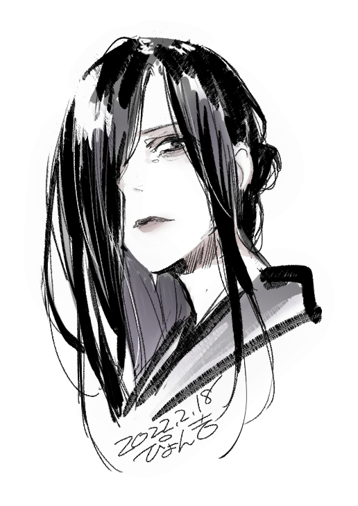 1girl black_hair closed_mouth dated grey_eyes greyscale hair_over_one_eye hatching_(texture) jigokuraku long_hair monochrome painterly pyon-kichi signature simple_background solo spot_color upper_body white_background