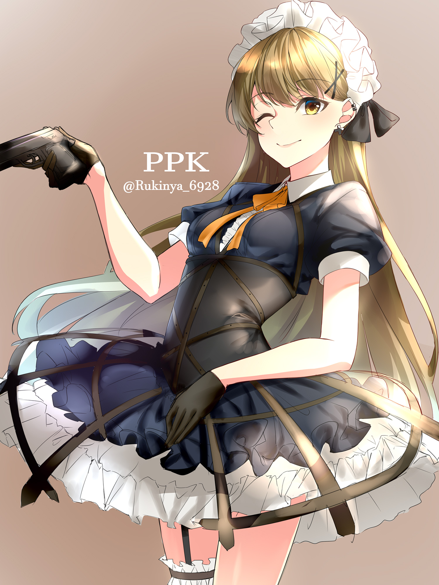 1girl black_gloves breasts girls'_frontline gloves gun handgun highres light_brown_hair long_hair medium_breasts one_eye_closed ppk_(girls'_frontline) puffy_short_sleeves puffy_sleeves rukinya_(nyanko_mogumogu) short_sleeves smile solo very_long_hair walther_ppk weapon