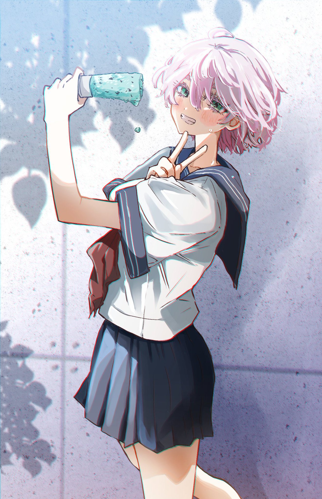 1girl akashi_senju colored_eyelashes commentary_request day food green_eyes grin hatopippi45 highres holding holding_food looking_at_viewer neckerchief pink_hair red_neckerchief sailor_collar school_uniform shadow short_hair skirt smile solo teeth tokyo_revengers v