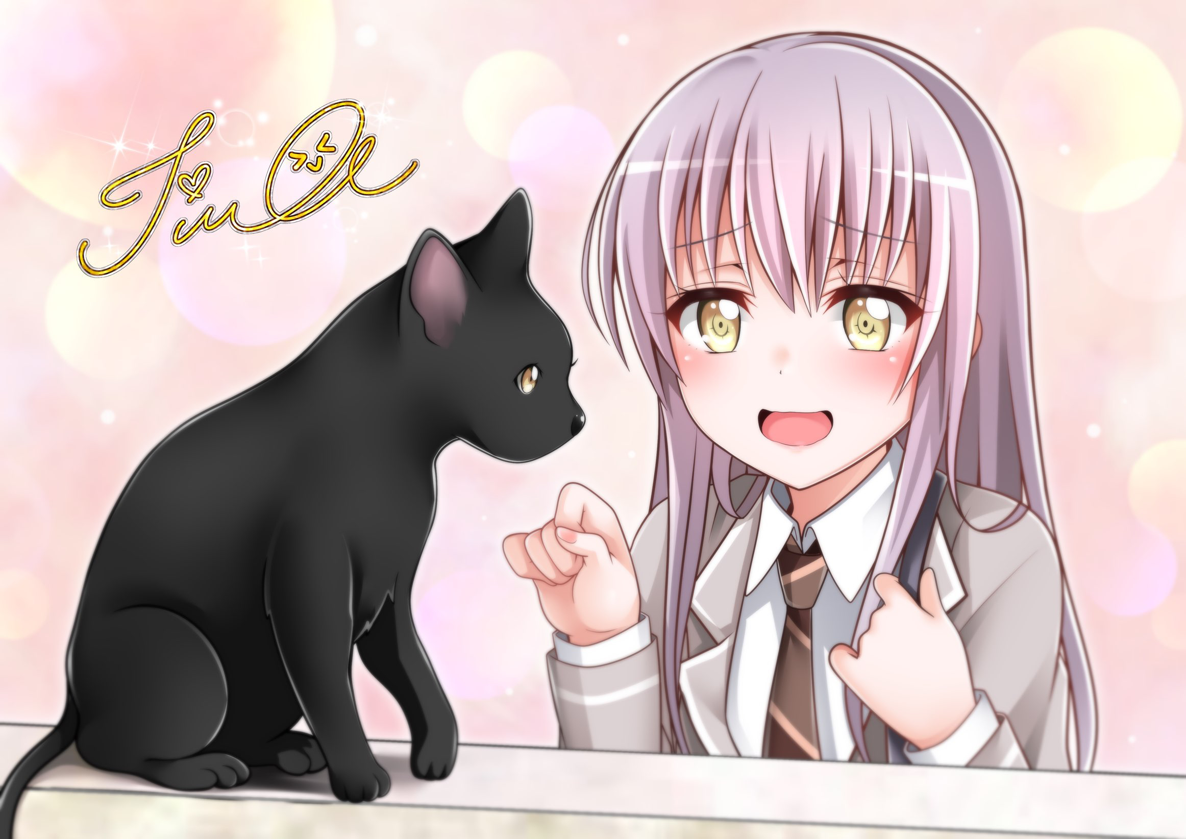 1girl animal artist_name bang_dream! bang_dream!_girls_band_party! black_cat blazer cat commission grey_hair hand_up haneoka_school_uniform highres jacket long_hair minato_yukina necktie open_mouth school_uniform skeb_commission smile solo tina1213 upper_body wall yellow_eyes