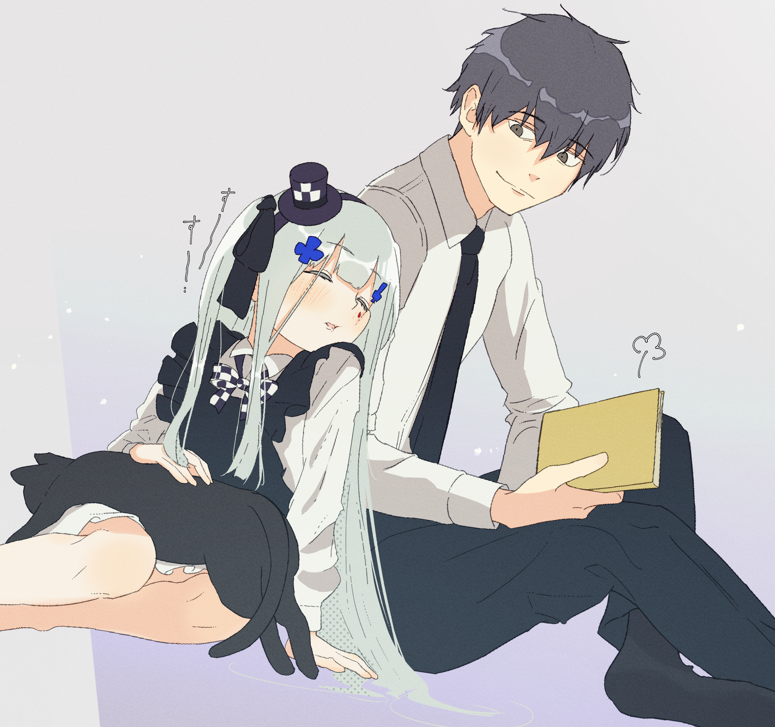 1boy 1girl absurdres animal apron aqua_hair black_apron black_cat book bow bowtie cat checkered_bow checkered_bowtie checkered_clothes commander_(girls'_frontline) closed_eyes girls'_frontline hat highres hk416_(black_kitty's_gift)_(girls'_frontline) hk416_(girls'_frontline) holding holding_animal holding_book holding_cat leaning_on_person long_hair mini_hat official_alternate_costume pants ryunosuke_nikaido shirt simple_background sitting sleeping tilted_headwear white_shirt aged_down
